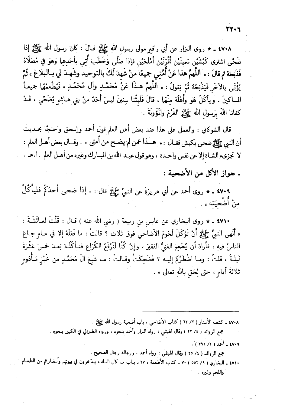 4708 - * روى البزار عن أبي رافع مولى رسول الله صلى الله عليه وسلم قال: كان رسول الله صلى الله عليه وسلم إذا ضحى اشترى كبشين سمينين أقرنين أملحين فإذا صلى وخطب أتى بأحدهما وهو في مُصلاه فذبحه ثم قال: "اللهم هذا عن أمتي جميعاً من شهد لك بالتوحيد وشهد لي بالبلاغ" ثم يؤتى بالآخر فيذبحه ثم يقول: اللهم هذا من محمد وآل محمدٍ" فيطعمهما جميعاً المساكين. ويأكل هو وأهله منهما، قال فلبثنا سنين ليس أحد من بني هاشم يُضحِّي، قد كفانا الله برسول الله صلى الله عليه وسلم الغرمَ والمؤونة.