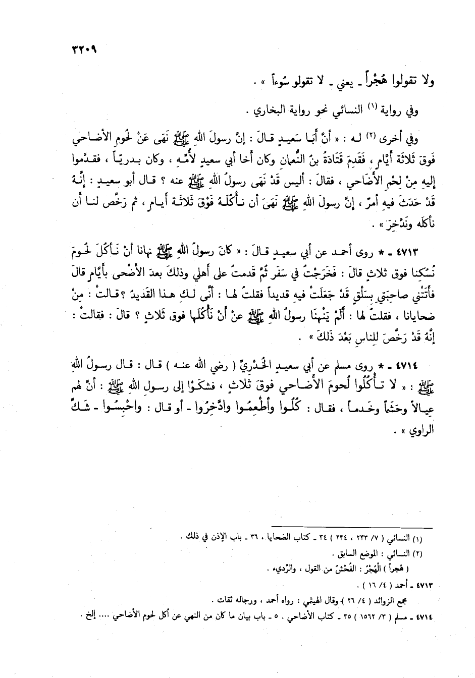 4713 - * روى أحمد عن أبي سعيد قال: "كان رسول الله صلى الله عليه وسلم نهانا أن نأكل لحوم نسكنا فوق ثلاثٍ قال: فخرجتُ في سفر ثم قدمتُ على أهلي وذلك بعد الأضحى بأيامٍ قال فأتتني صاحبتي بسلقٍ قد جعلتْ فيه قديداً فقلت لها: أني لك هذا القديدُ؟ قالت: من ضحايانا، فقلت لها: ألم ينهنا رسول الله صلى الله عليه وسلم عن أن نأكلها فوق ثلاثٍ؟ قال: فقالت: إنه قد رخص للناس بعد ذلك".