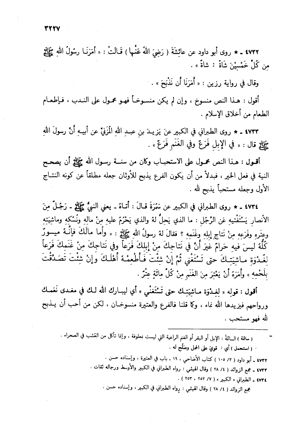 4734 - * روى الطبراني في الكبير عن سمُرة قال: أتاه - يعني النبي صلى الله عليه سلم - رجلٌ من الأنصار يستفتيه عن الرجل: ما الذي يحلُّ له والذي يحرُم عليه من ماله ونسكه وماشيته وعتره وفرعه من نتاج إبله وغنمه؟ فقال له رسول الله صلى الله عليه وسلم: "وأما مالك فإنه ميسورٌ كلُّه ليس فيه حرامٌ غير أن في نتاجك من إبلك فرعاً وفي نتاجك من غنمك فرعاً لغدوة ماشيتك حتى تستغني ثم إن شئت فأطعمهُ أهلك وإن شئت تصدقت بلحمه" وأمرهُ أن يعتر من الغنم من كل مائةٍ عترٌ.