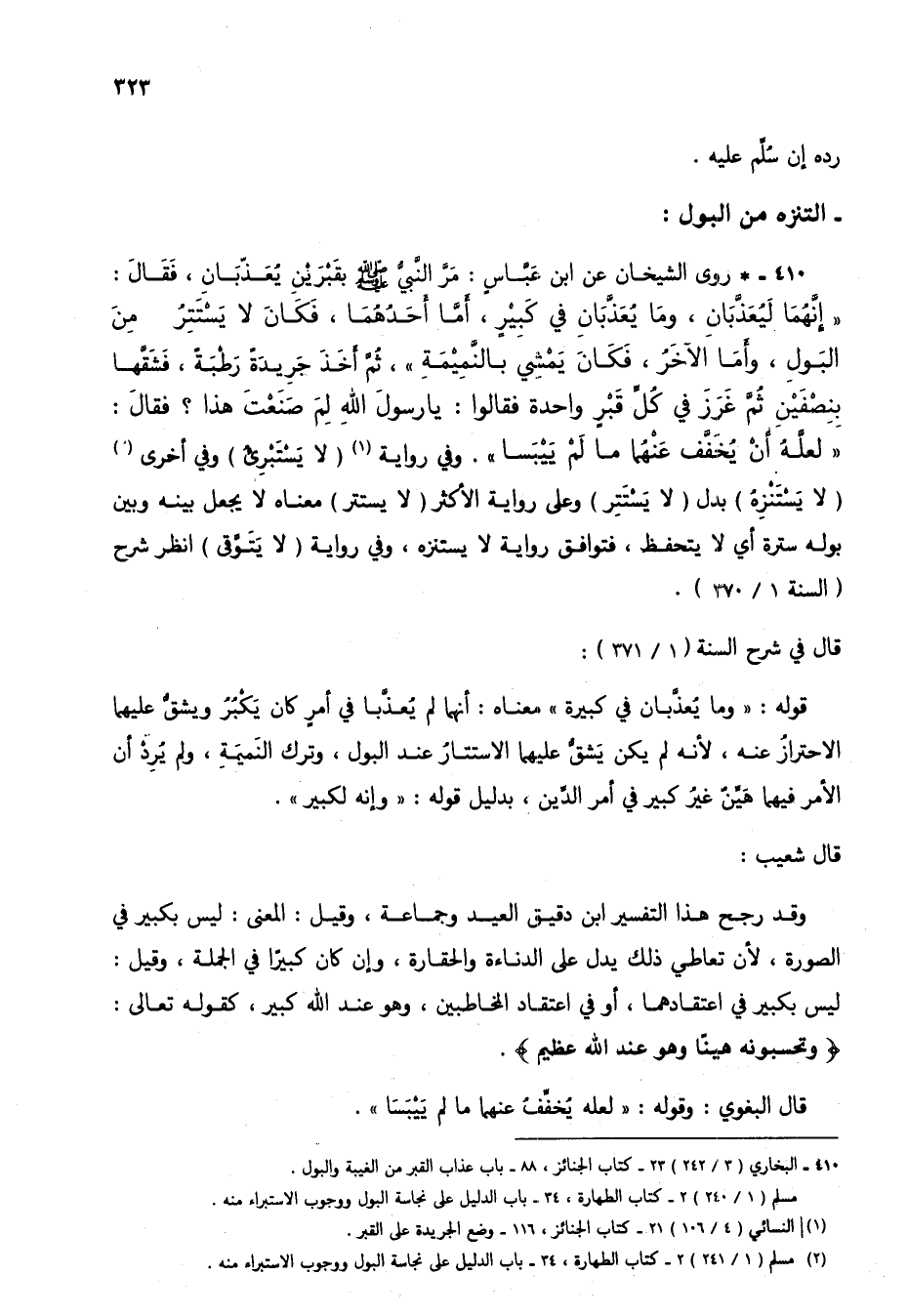 410 - * روى الشيخان عن ابن عباس: مر النبي صلى الله عليه وسلم بقبرين يُعذبان، فقال: "إنهما ليُعذبان، وما يُعذبان في كبير، أما أحدهما، فكان لا يستترُ من البول، وأما الآخر، فكان يمشي بالنميمة"، ثم أخذ جريدة رطبةً، فشقها بنصفين ثم غرز في كل قبرٍ واحدة فقالوا: يا رسول الله صلى لِمَ صنعتَ هذا؟ فقال: "لعله أن يخفف عنهما ما لم ييبسا". وفي رواية (1) (لا يستبرئ) (2) وفي أخرى (لا يستنزهُ) بدل (لا يستتر) وعلى رواية الأكثر (لا يستتر) معناه لا يجعل بينه وبين بوله سترة أي لا يتحفظ، فتوافق رواية لا يستنزه، وفي رواية (لا يتوقى) انظر شرح (السنة 1/ 370).