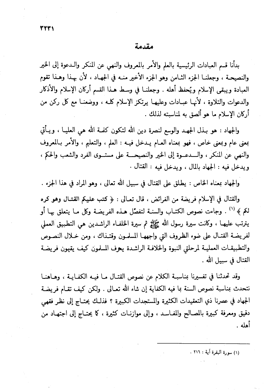 وقد تحدثنا في تفسيرنا بمناسبة الكلام عن نصوص القتال ما فيه الكفاية، وهاهنا نتحدث بمناسبة نصوص السنة بما فيه الكفاية إن شاء الله تعالى. ولكن كيف تقام فريضة الجهاد في عصرنا ذي التعقيدات الكثيرة والمستجدات الكبيرة؟ فذلك يحتاج إلى نظر فقهي دقيق ومعرفة كبيرة بالمصالح والمفاسد، وإلى موازنات كثيرة، كما يحتاج إلى اجتهاد من أهله.