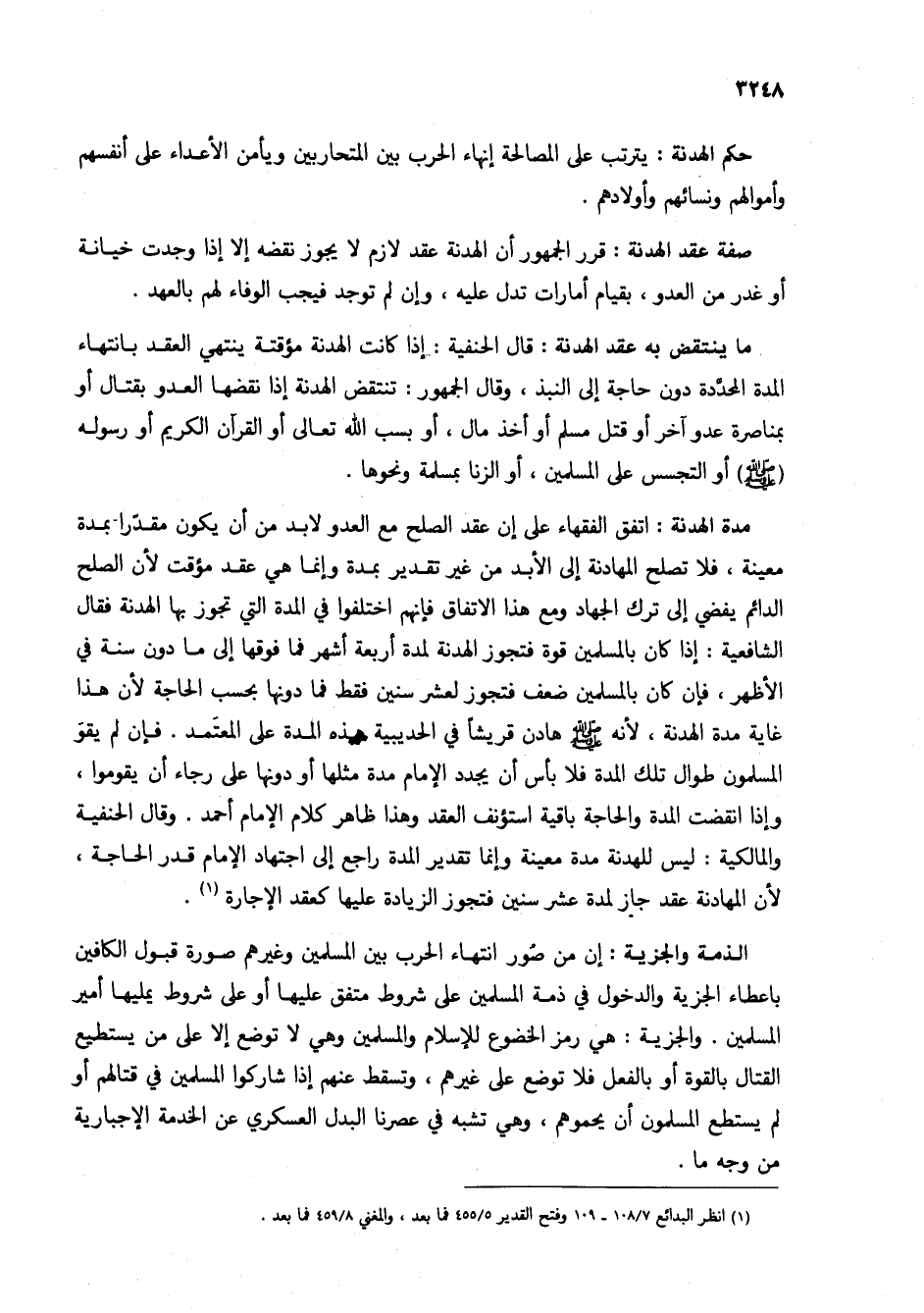 الذمة والجزية: إن من صور انتهاء الحرب بين المسلمين وغيرهم صورة قبول الكافين باعطاء الجزية والدخول في ذمة المسلمين على شروط متفق عليها أو على شروط يمليها أمير المسلمين. والجزية: هي رمز الخضوع للإسلام والمسلمين وهي لا توضع إلا على من يستطيع القتال بالقوة أو بالفعل فلا توضع على غيرهم، وتسقط عنهم إذا شاركوا المسلمين في قتالهم أو لم يستطع المسلمون أن يحموهم، وهي تشبه في عصرنا البدل العسكري عن الخدمة الإجبارية من وجه ما.