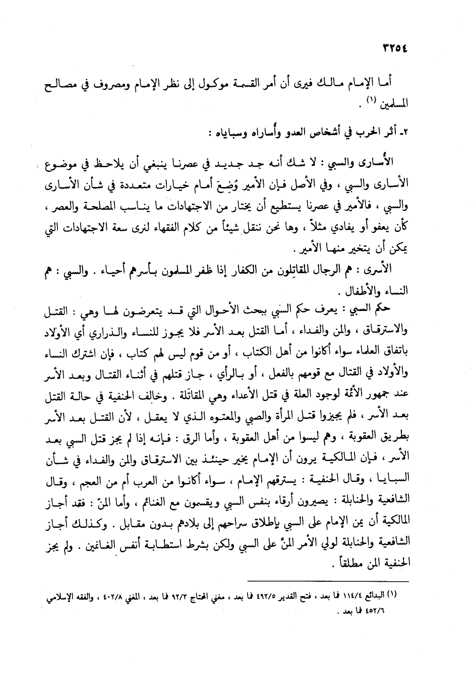 الأسارى والسبى: لاشك أنه جد جديد في عصرنا ينبغي أن يلاحظ في موضوع الأسارى والسبي، وفي الأصل فإن الأمير وُضِعَ أمام خيارات متعددة في شأن الأسارى والسبي، فالأمير في عصرنا يستطيع أن يختار من الاجتهادات ما يناسب المصلحة والعصر، كأن يعفو أو يفادي مثلاً، وها نحن ننقل شيئاً من كلام الفقهاء لنرى سعة الاجتهادات التي يمكن أن يتخير منها الأمير.