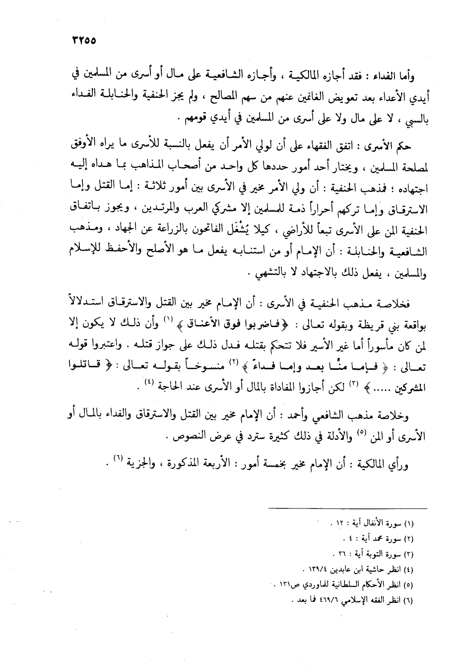 حكم الأسرى: اتفق الفقهاء على أن لولي الأمر أن يفعل بالنسبة للأسرى ما يراه الأوفق لمصلحة المسلمين، ويختار أحد أمور حددها كل واحد من أصحاب المذاهب بما هداه إليه اجتهاده؛ فمذهب الحنفية: أن ولي الأمر مخير في الأسرى بين أمور ثلاثة: إما القتل وإما الاسترقاق وإما تركهم أحراراً ذمة للمسلمين إلا مشركي العرب والمرتدين، ويجوز باتفاق الحنفية المن على الأسرى تبعاً للأراضي، كيلا يُشغَل الفاتحون بالزراعة عن الجهاد، ومذهب الشافعية والحنابلة: أن الإمام أو من استنابه يفعل ما هو الأصلح والأحفظ للإسلام والمسلمين، يفعل ذلك بالاجتهاد لا بالتشهي.