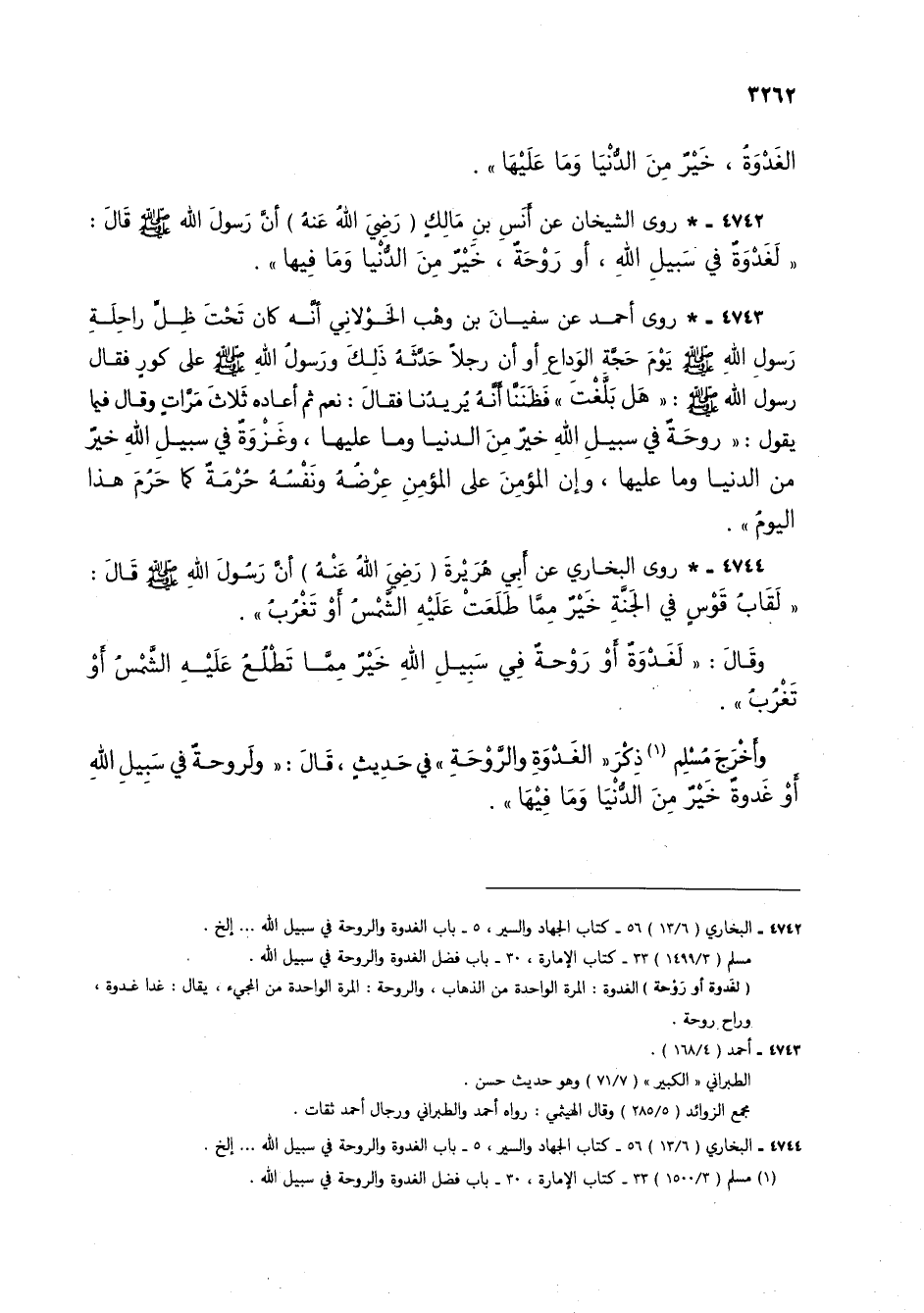 4742 - * روى الشيخان عن أنس بن مالك (رضي الله عنه) أن رسول الله صلى الله عليه وسلم قال: "لغدوةٌ في سبيل الله، أو روحةٌ، خيرٌ من الدنيا وما فيها".