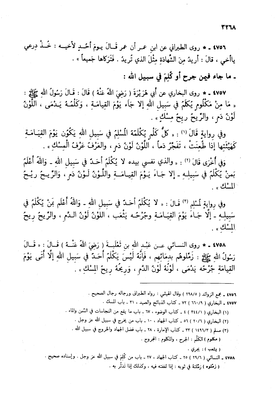 4758 - * روى النسائي عن عبد الله بن ثعلبة (رضي الله عنه) قال: "قال رسول الله صلى الله عليه وسلم: زمِّلوهُم بدمائهم، فإنه ليس يكلم أحدٌ في سبيل الله إلا أتى يوم القيامة جُرحه يدمى، لونه لونُ الدم، وريحه ريحُ المسك".