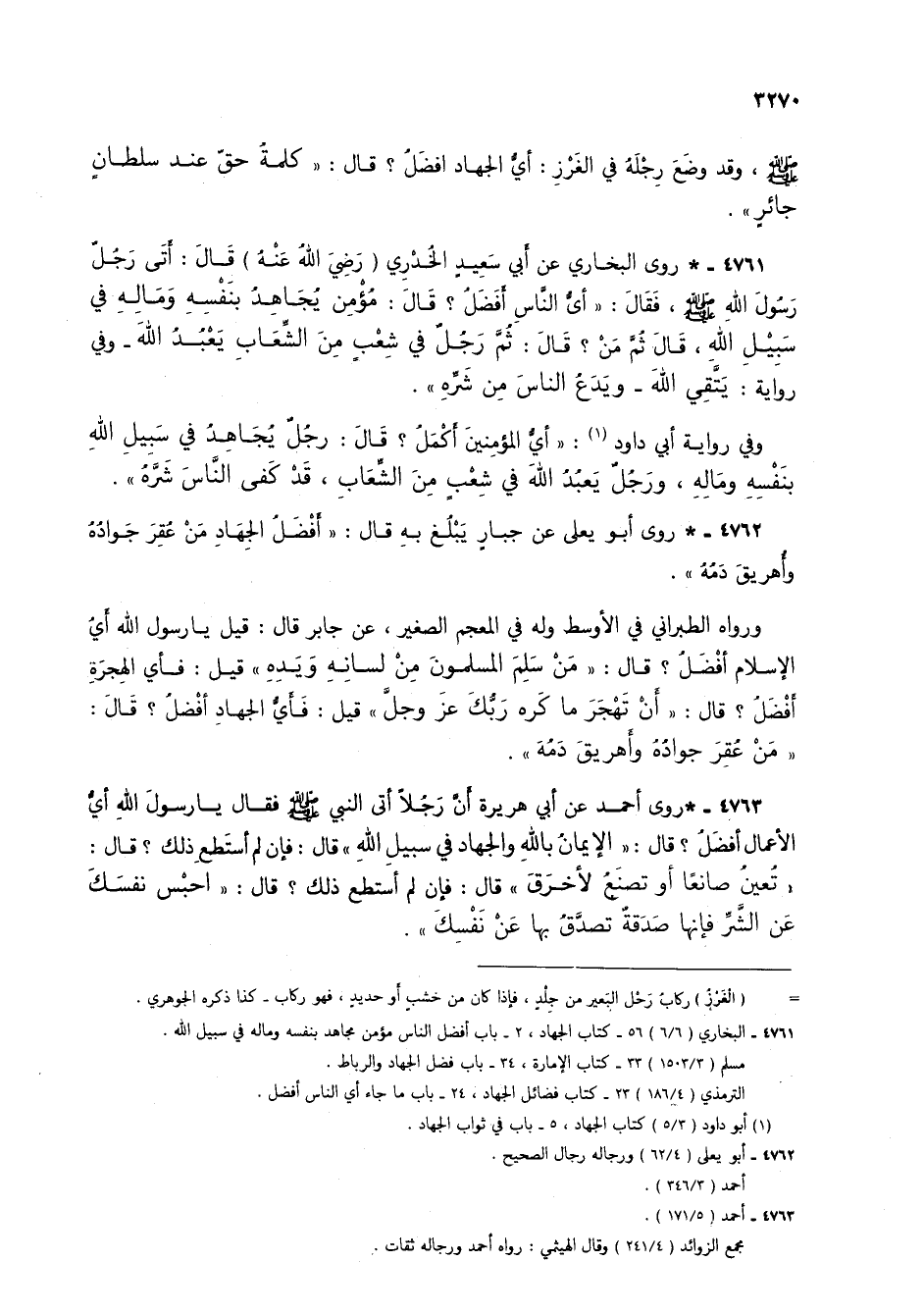 4762 - * روى أبو يعلي عن جبارٍ يبلغ به قال: "أفضل الجهاد من عُقر جواده وأهريق دمه".