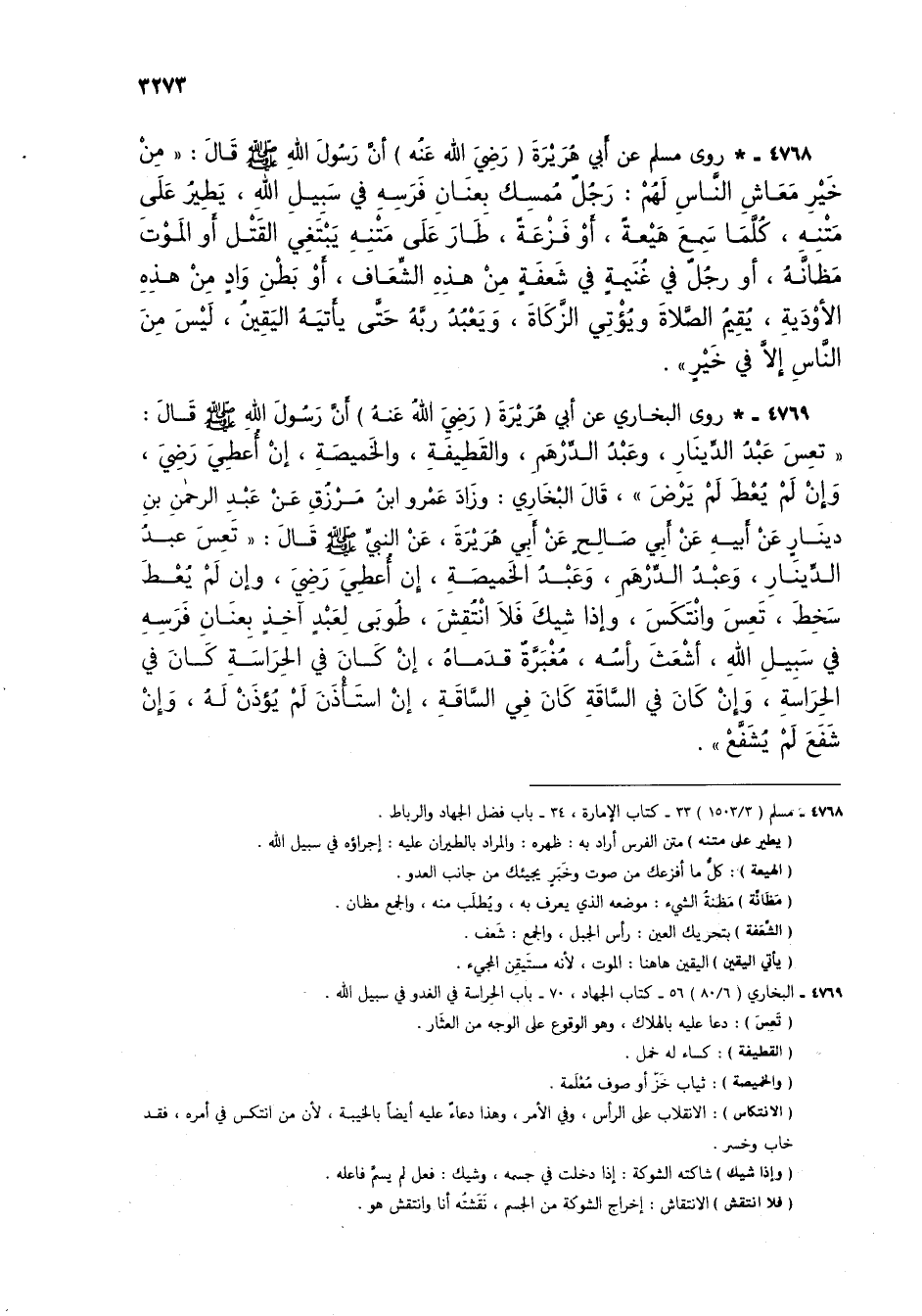 4769 - * روى البخاري عن أبي هريرة (رضي الله عنه) أن رسول الله صلى الله عليه وسلم قال: "تعس عبدُ الدينار، وعبد الدرهم، والقطيفة، والخميصة، إن أُعطي رضي، وإن لم يعط لم يرض"، قال البخاري: وزاد عمرو ابن مرزُقِ عن عبد الرحمن بن دينار عن أبيه عن أبي صالحٍ عن أبي هريرة، عن النبي صلى الله عليه سلم قال: "تعسَ عبد الدينار، عبد الدرهم، وعبد الخميصة، إن أُعطي رضي، وإن لم يعط سخط، تعس وانتكس، وإذا شيك فلا انتُقش، طُوبى لعبدٍ آخذٍ بعنان فرسه في سبيل الله، أشعث رأسه، مغبرةٌ قدماه، إن كان في الحراسة كان في الحراسة، وإن كان في الساقة كان في الساقة، إن استأذن لم يؤذن له، وإنْ شفع لم يُشفعْ" (1).
