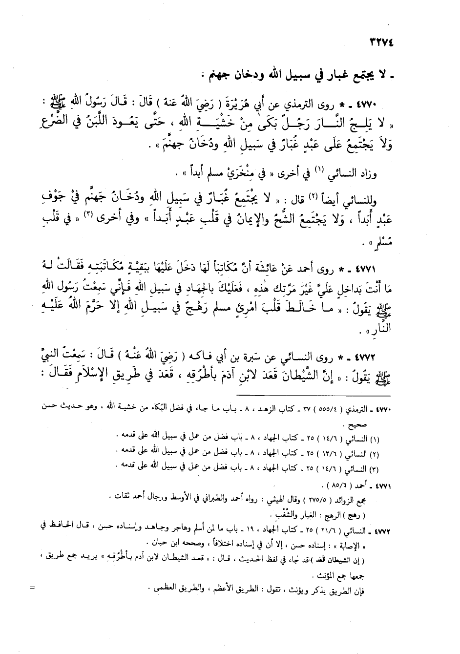 4770 - * روى الترمذي عن أبي هريرة (رضي الله عنه) قال: قال رسول الله صلى الله عليه وسلم: "لا يلجُ النار رجلٌ بكى من خشية الله، حتى يعودَ اللبنُ في الضَّرع ولا يجتمعُ على عبدٍ غبارٌ في سبيل الله ودُخانُ جهنم".