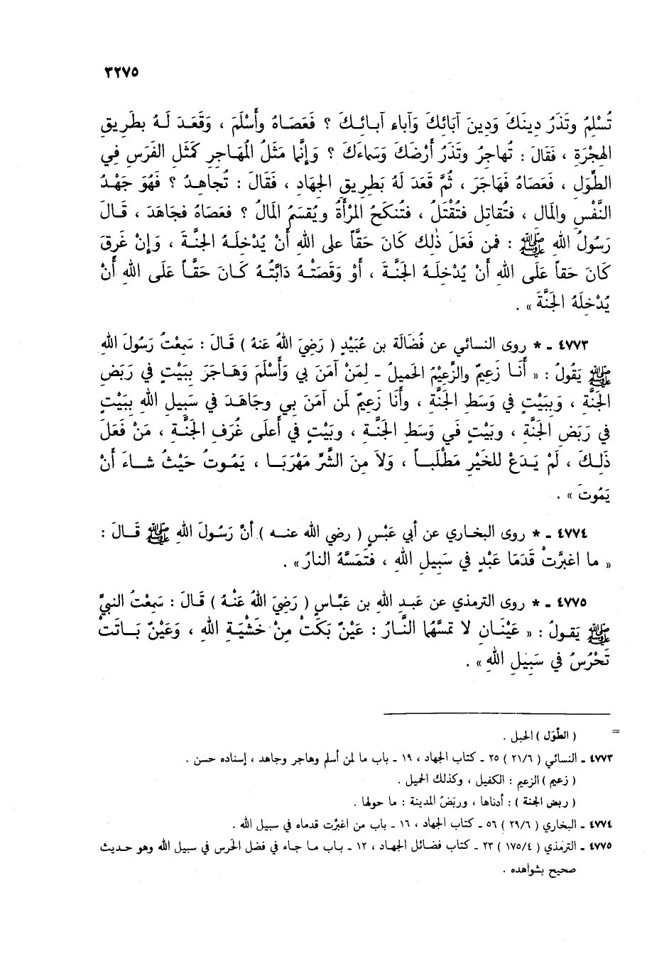 4773 - * روى النسائي عن فُضالة بن عبيدٍ (رضي الله عنه) قال: سمعتُ رسول الله صلى الله عليه وسلم يقول: "أنا زعيمٌ والزعيم الحميلُ - لمن آمن بي وأسلم وهاجر ببيتٍ في ربضِ الجنة، وببيتٍ في وسط الجنة، وأنا زعيمٌ لمن آمن بي وجاهد في سبيل الله ببيتٍ في ربض الجنةِ، وبيتٍ في وسط الجنة، وبيتٍ في أعلى غُرفِ الجنة، من فعلَ ذلك، لم يدعْ للخير مطلباً، ولا من الشرِّ مهرباً، يموتُ حيث شاء أنْ يموتَ".