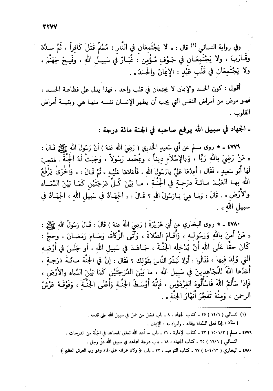 وفي رواية النسائي (1) قال: "لا يجتمعان في النار: مسلمٌ قتل كافراً، ثم سدد وقارب، ولا يجتمعان في جوف مؤمن: غبارٌ في سبيل الله، وفيحُ جهنم، ولا يجتمعان في قلب عبدٍ: الإيمانُ والحسدُ".