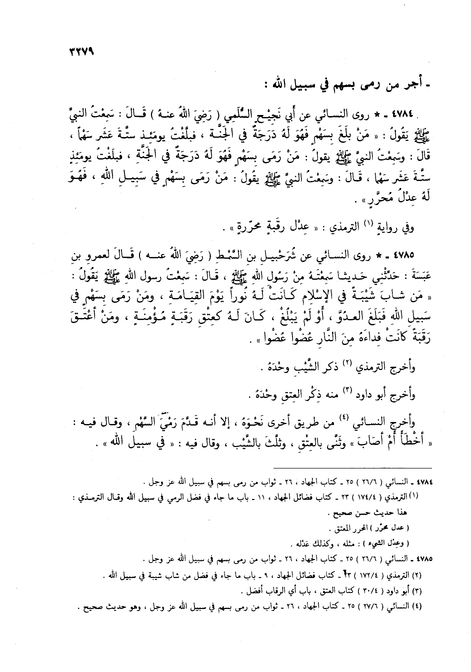 4784 - * روى النسائي عن أبي نجيحٍ السُّلمي (رضي الله عنه) قال: سمعتُ النبي صلى الله عليه وسلم يقول: "من بلغ بسهمٍ فهو له درجةٌ في الجنة، فبلغتُ يومئذ ستة عشر سهماً، قال: وسمعتُ النبي صلى الله عليه وسلم يقول: من رمي بسهم فهو له درجةٌ في الجنة، فبلغتُ يومئذ ستة عشر سهما، قال: وسمعتُ النبي صلى الله عليه وسلم يقول: من رمى بسهمٍ في سبيل الله، فهو له عدلُ محررٍ".