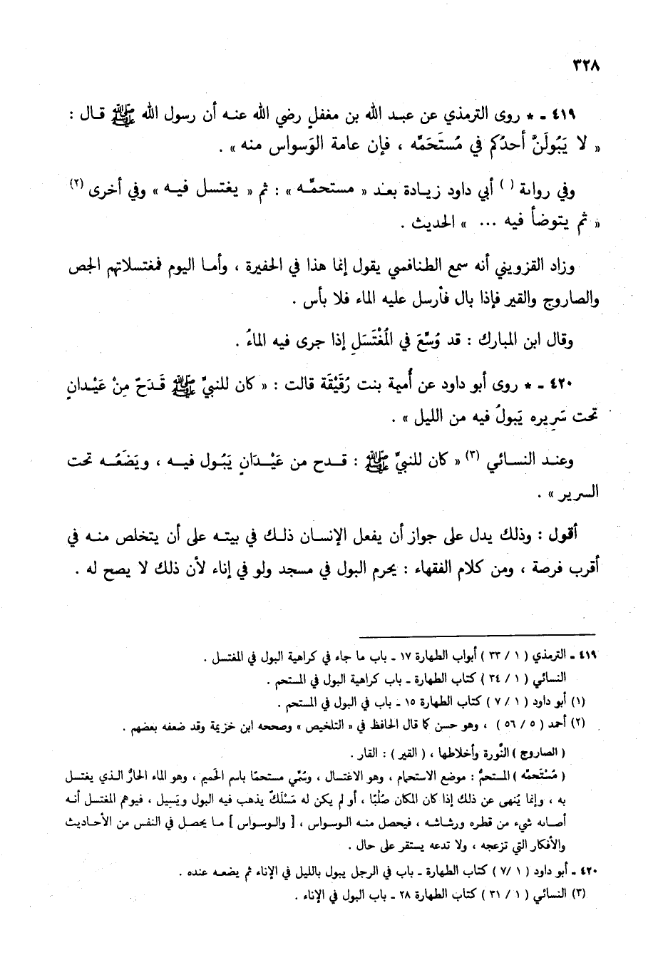 419 - * روى الترمذي عن عبد الله بن مغفلٍ رضي الله عنه أن رسول الله صلى الله عليه وسلم قال: "لايبولن أحدكم في مستحمه، فإن عامة الوسواس منه".