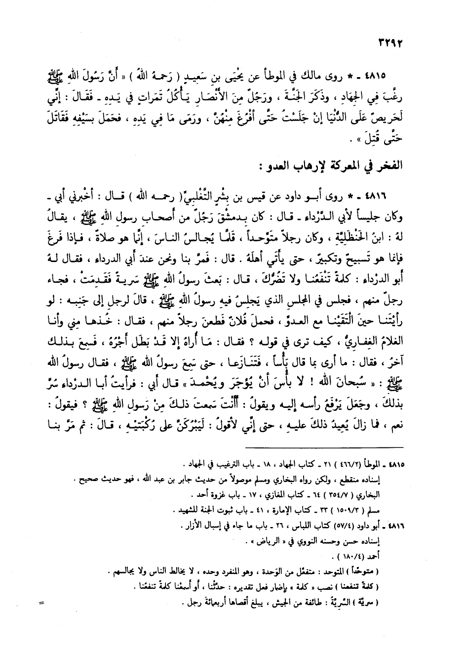4816 - * روى أبو داود عن قيس بن بشرٍ التغلبي (رحمه الله) قال: أخبرني أبي - وكان جليساً لأبي الدرداء- قال: كان بدمشقَ رجلٌ من أصحاب رسول الله صلى الله عليه وسلم، يقالُ له: ابن الحنظلية، وكان رجلاً متوحداً، قلما يُجالس الناس، إنما هو صلاةٌ، فإذا فرغ فإنما هو تسبيحٌ وتكبيرٌ، حتى يأتي أهله. قال: فمر بنا ونحن عند أبي الدرداء، فقال له أبو الدرداء: كلمة تنفعنا ولا تضُرُّك، قال: بعث رسول الله صلى الله عليه وسلم سريةً فقدمَتْ، فجاء رجل منهم، فجلس في المجلس الذي يجلس فيه رسول الله صلى الله عليه وسلم، قال لرجل إلى جنبه: لو رأيتنا حين التقينا مع العدو، فحمل فُلانٌ فطعن رجلاً منهم، فقال: خُذها مني وأنا الغلام الغفاريُّ، كيف ترى في قوله؟ فقال: ما أُراهُ إلا قد بطل أجره، فسمع بذلك آخر، فقال: ما أرى بما قال بأساً، فتنازعا، حتى سمع رسول الله صلى الله عليه وسلم، فقال رسول الله صلى الله عليه وسلم: "سبحان الله! لا بأس أن يُؤجر ويُحمد" قال أبي: فرأيت أبا الدرداء سُرَّ بذلك، وجعل يرفع رأسه إليه ويقول: أأنت سمعت ذلك من رسول الله صلى الله عليه وسلم؟ فيقول: نعم، فما زال يعيد ذلك عليه، حتى إني لأقول: ليبرُكن على ركبتيه، قال (1): ثم مر بنا