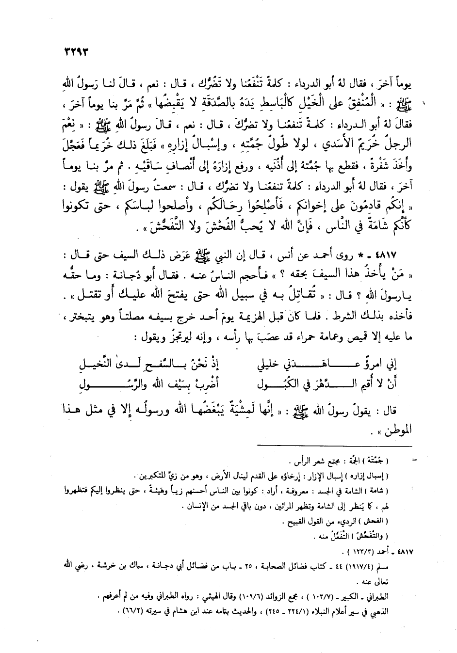 يوماً آخر، فقال له أبو الدرداء: كلمةً تنفعنا ولا تضرُّك، قال: نعم، قال لنا رسول الله صلى الله عليه وسلم: "المنفقُ على الخيلِ كالباسط يده بالصدقة لا يقبضها" ثم مر بنا يوماً آخر، فقال له أبو الدرداء: كلمةً تنفعنا ولا تضرُّك، قال: نعم، قال رسول الله صلى الله عليه وسلم: "نِعْمَ الرجل خريمٌ الأسدي، لولا طولُ جُمته، وإسبالُ إزاره" فبلغ ذلك خُريماً فعجل وأخذ شفرةً، فقطع بها جُمته إلى أذنيه، ورفع إزارهُ إلى أنصاف ساقيه. ثم مر بنا يوماً آخر، فقال له أبو الدرداء: كلمةً تنفعُنا ولا تضرُّك، قال: سمعتُ رسول الله صلى الله عليه وسلم يقول: "إنكُم قادمون على إخوانكم، فأصلِحُوا رحالكم، وأصلحوا لباسكم، حتى تكونوا كأنكم شامةٌ في الناس، فإن الله لا يحب الفُحش ولا التفَحُّش".