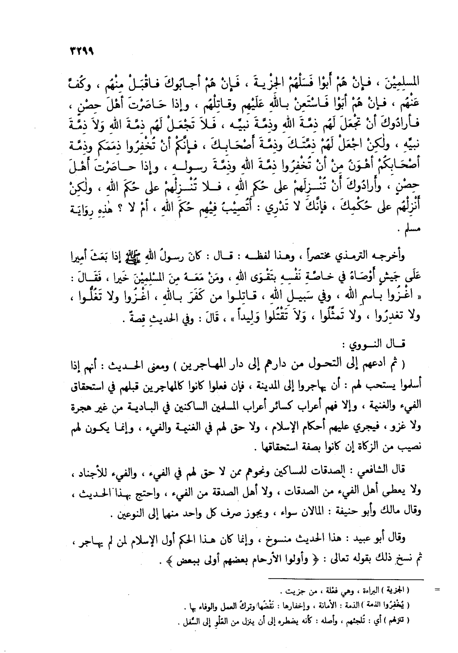 المسلمين، فإن هم أبوا فسلهم الجزية، فإن هم أجابوك فاقبل منهم، وكُف عنهم، فإن هم أبوا فاستعن بالله عليهم وقاتلهم، وإذا حاصرت أهل حصنٍ، فأرادُوك أن تجعل لهم ذمة الله وذمة نبيه، فلا تجعلْ لهم ذمة الله ولا ذمة نبيه، ولكن اجعل لهم ذمتك وذمة أصحابك، فإنكم أن تُخفرُوا ذممكم وذمة أصحابكم أهونُ من أنْ تُخفروا ذمة الله وذمة رسوله، وإذا حاصرت أهل حصنٍ، وأرادُوك أن تُنزلهم على حكم الله، فلا تنزلهم على حكم الله، ولكن أنزلهم على حكمك، فإنك لا تدري: أتصيبُ فيهم حكم الله، أم لا؟ هذه رواية مسلم.