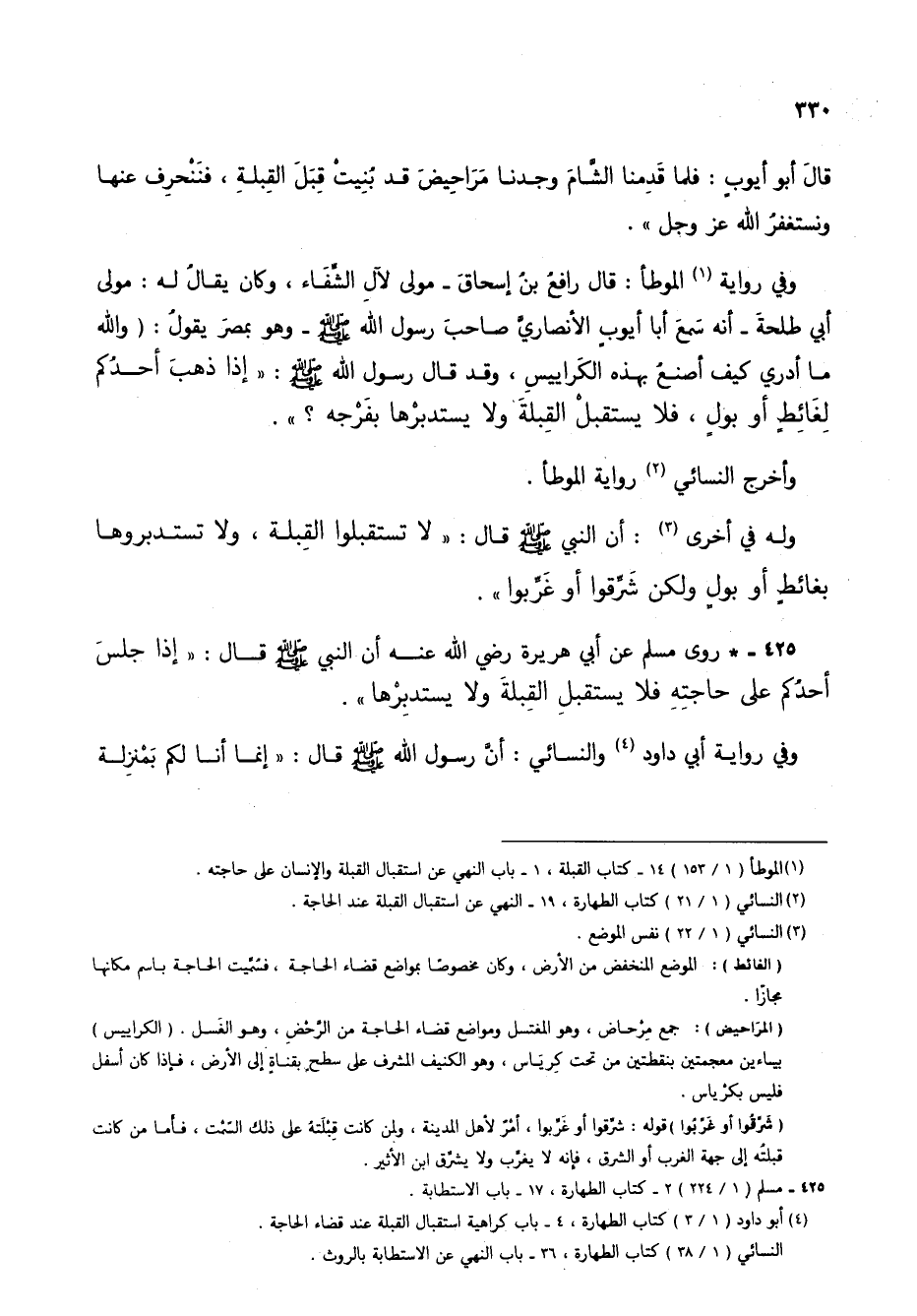 425 - * روى مسلم عن أبي هريرة رضي الله عنه أن النبي صلى الله عليه وسلم قال: "إذا جلس أحدكم على حاجته فلا يستقبل القبلة ولا يستدبرها".
