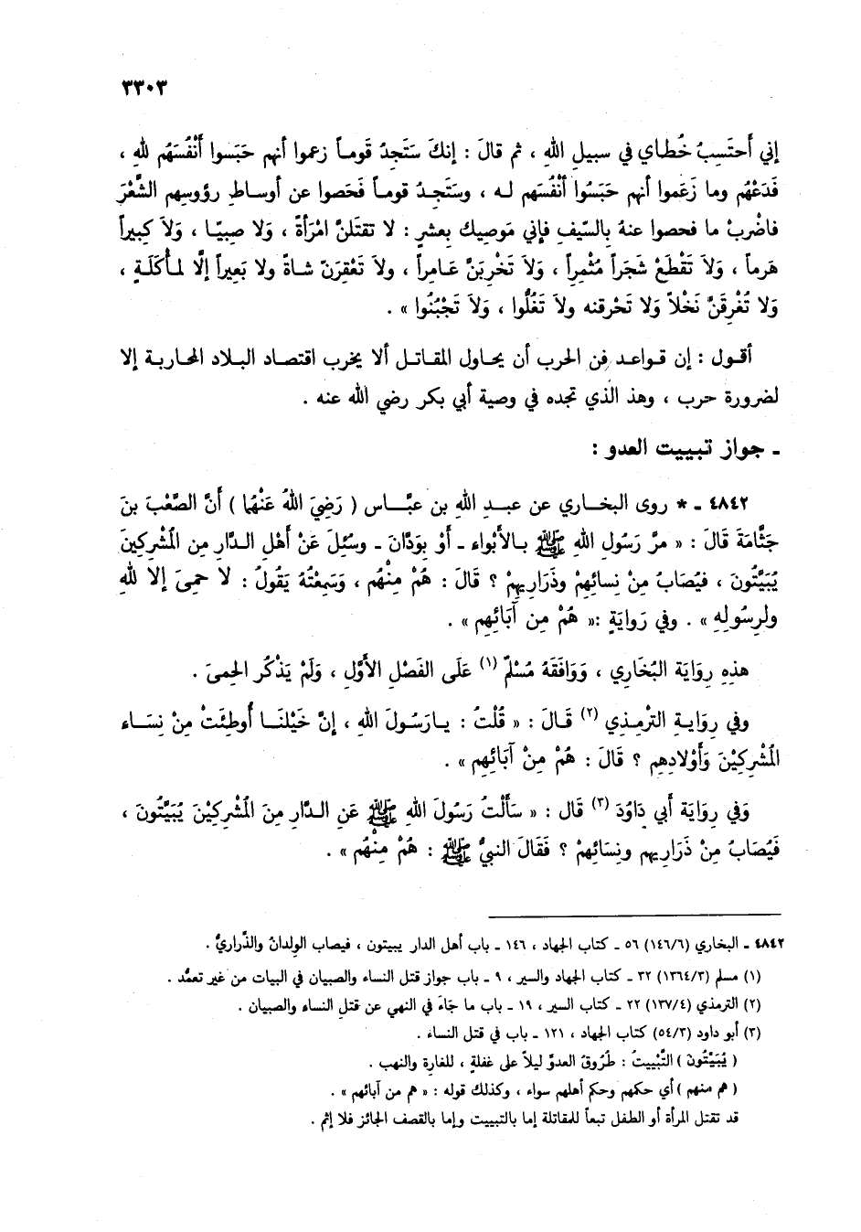 4842 - * روى البخاري عن عبد الله بن عباس (رضي الله عنهما) أن الصعب بن جثامة قال: "مر رسول الله صلى الله عليه وسلم بالأبواء - أو بودان - وسُئل عن أهل الدار من المشركين يُبيتُون، فيُصاب من نسائهم وذراريهمْ؟ قال: هُمْ منهم، وسمعتُه يقول: لا حمى إلا لله ولرسوله". وفي رواية: "هُمْ من آبائهم".