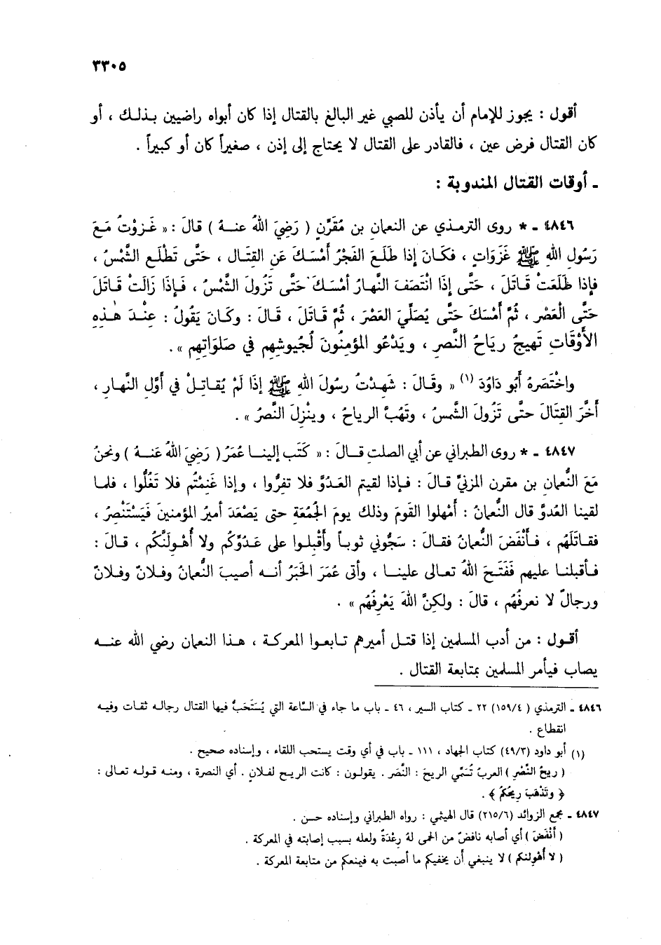 4846 - * روى الترمذي عن النعمان بن مُقرنٍ (رضي الله عنه) قال: "غزوتُ مع رسول الله صلى الله عليه وسلم غزواتٍ، فكان إذا طلع الفجرُ أمسك عن القتال، حتى تطلع الشمسُ، فإذا طلعتْ قاتل، حتى إذا انتصف النهار أمسك حتى تزول الشمس، فإذا زالت قاتل حتى العصر، ثم أمسك حتى يُصلي العصر، ثم قاتل، قال: كان يقول: عند هذه الأوقات تهيجُ رياحُ النصر، ويدعو المؤمنون لجيوشهم في صلواتهم".