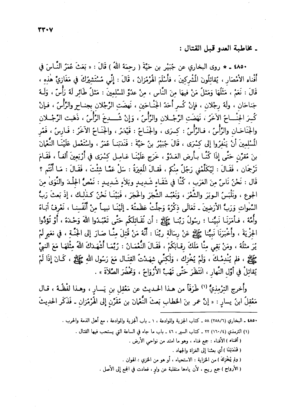 4850 - * روى البخاري عن جُبير بن حية (رحمه الله) قال: "بعث عمر الناس في أفناء الأمصار، يقاتلون المشركين، فأسلم الهرمزانُ، قال: إني مستشيرك في مغازي هذه، قال: نعم، مثلها ومثل من فيها من الناس، من عدوِّ المسلمين: مثلُ طائر له رأسٌ، وله جناحان، وله رجلان، فإن كُسر أحد الجناحين، نهضت الرجلان بجناحِ والرأسُ، فإن كسر الجناح الآخر، نهضت الرجلان والرأس، وإن شُدخَ الرأسُ، ذهبت الرجلان والجناحان والرأس، فالرأس: كسرى، والجناح: قيصر، والجناح الآخر: فارس، فمر المسلمين أن ينفروا إلى كسرى، قال جبير بن حية: فندبنا عمر، واستعمل علينا النعمان بن مُقرنٍ حتى إذا كنا بأرض العدو، خرج علينا عامل كسرى في أربعين ألفاً، فقام ترجمان، فقال: ليكلمني رجلٌ منكم، فقال المغيرة: سل عما شئت، فقال: ما أنتم؟ قال: نحن ناسٌ من العرب، كنا في شقاءٍ شديدٍ وبلاءٍ شديدٍ: نمصُّ الجلد والنوى من الجوع، ونلبسُ الوبر والشعر، ونعبد الشجر والحجر، فبينا نحن كذلك، إذ بعث ربُّ السماوات ورب الأرضين - تعالى ذكره وجلت عظمته - إلينا نبياً من أنفسنا، نعرفُ أباه وأمه، فأمرنا نبينا؛ رسول ربنا صلى الله عليه وسلم: أن نقاتلكم حتى تعبدوا الله وحده، أو تؤدوا الجزية، وأخبرنا نبينا صلى الله عليه وسلم عن رسالة ربنا: أنه من قُتل منا صار إلى الجنة، في نعيم لمْ يُرَ مثله، ومن بقي منا ملك رقابكم، فقال النعمان: ربما أشهدك الله مثلها مع النبي صلى الله عليه وسلم، فلم يُندمك، ولم يخزك، ولكني شهدتُ القتال مع رسول الله صلى الله عليه وسلم، كان إذا لمْ يقاتل في أول النهار، انتظر حتى تهُب الأرواح، وتحضُر الصلاة".
