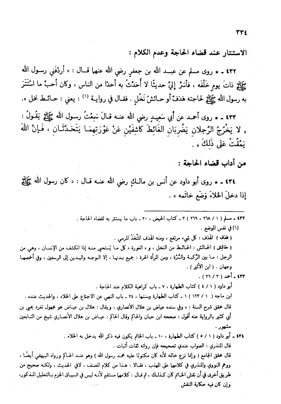 432 - * روى مسلم عن عبد الله بن جعفر رضي الله عنهما قال: "أردفني رسول الله صلى الله عليه وسلم ذات يوم خلفه، فأسر إليَّ حديثاً لا أحدثُ به أحداً من الناس، وكان أحبُّ ما استتر به رسول الله صلى الله عليه وسلم لحاجته هدفٌ أو حائشُ نخلٍ. فقال في رواية (1): يعني: حائط نخل".