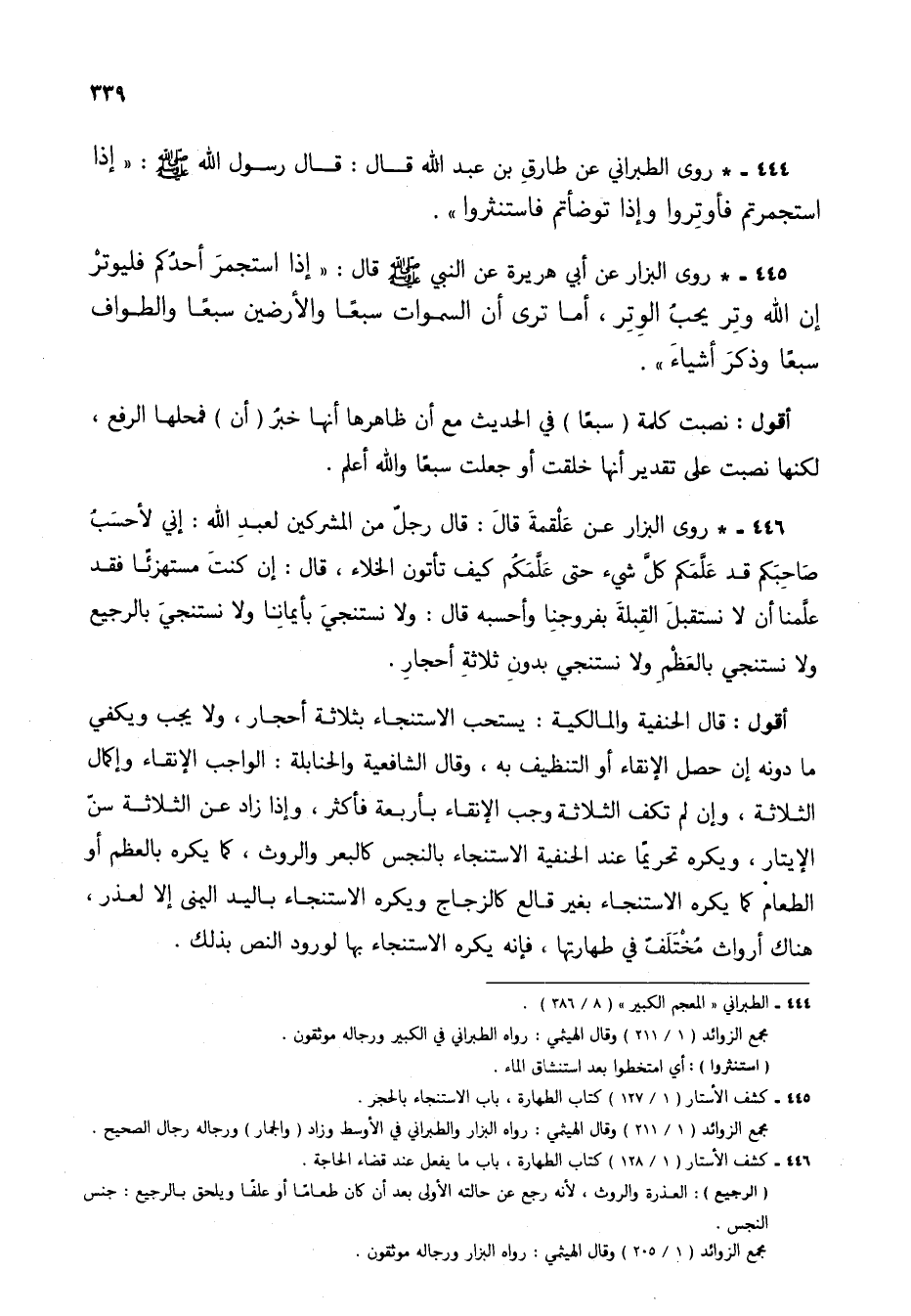 444 - * روى الطبراني عن طارق بن عبد الله قال: قال رسول الله صلى الله عليه وسلم: "إذا استجمرتم فأوتروا وإذا توضأتم فاستنثروا".