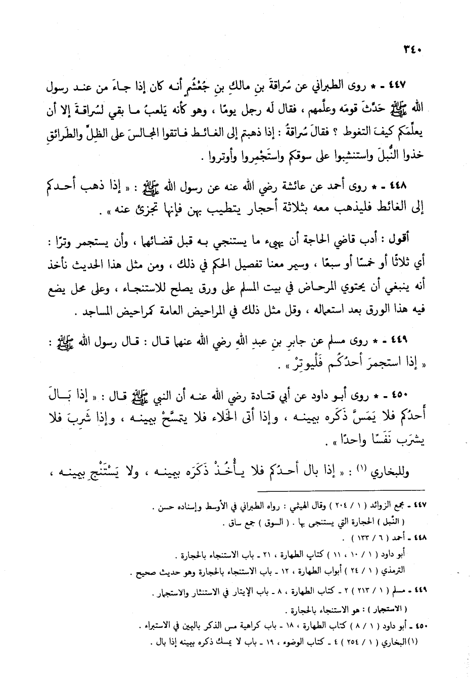449 - * روى مسلم عن جابر بن عبد الله عنهما قال: قال رسول الله صلى الله عليه وسلم: "إذا استجمر أحدكم فليوتِرْ".