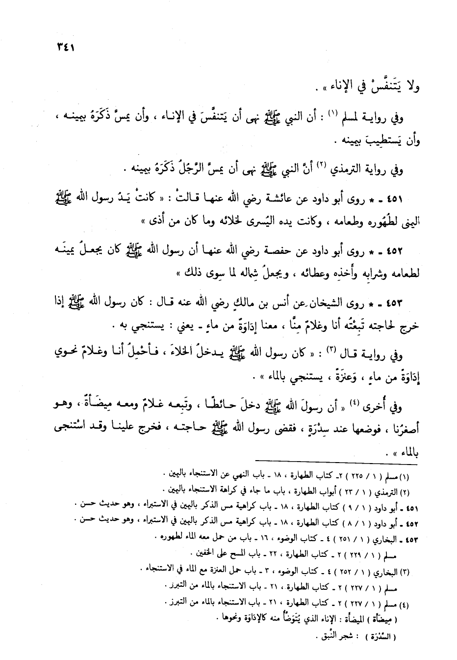 451 - * روى أبو داود عن عائشة رضي الله عنها قالت: "كانت يد رسول الله صلى الله عليه وسلم اليمنى لطهوره وطعامه، وكانت يده اليسرى لخلائه وما كان من أذى".