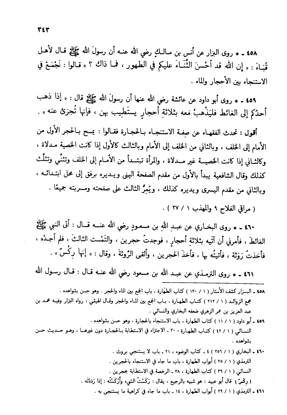 459 - * روى أبو داود عن عائشة رضي الله عنها أن رسول الله صلى الله عليه وسلم قال: "إذا ذهب أحدكم إلى الغائط فليذهب معه بثلاثة أحجارٍ يستطيب بهن، فإنها تُجزئ عنه".