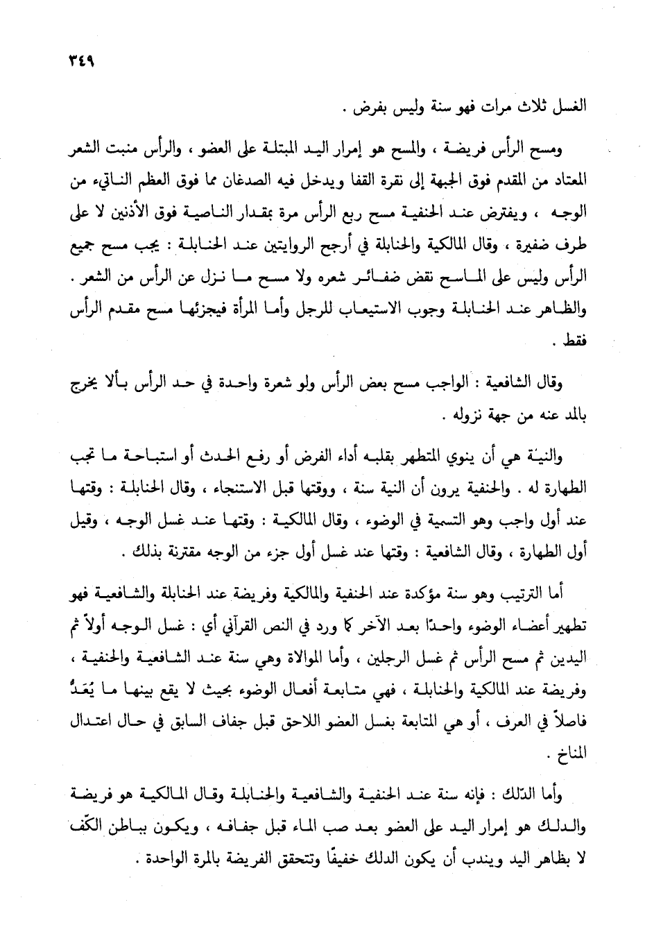 ومسح الرأس فريضة، والمسح هو إمرار اليد المبتلة على العضو، والرأس منبت الشعر المعتاد من المقدم فوق الجبهة إلى نقرة القفا ويدخل فيه الصدغان مما فوق العظم الناتئ من الوجه، ويفترض عند الحنفية مسح ربع الرأس مرة بمقدار الناصية فوق الأذنين لا على طرف ضفيرة، وقال المالكية والحنابلة في أرجح الوايتين عند الحنابلة: يجب مسح جميع الرأس وليس على الماسح نقض ضفائر شعره ولا مسح ما نزل عن الرأس من الشعر. والظاهر عند الحنابلة وجوب الاستيعاب للرجل وأما المرأة فيجزئها مسح مقدم الرأس فقط.