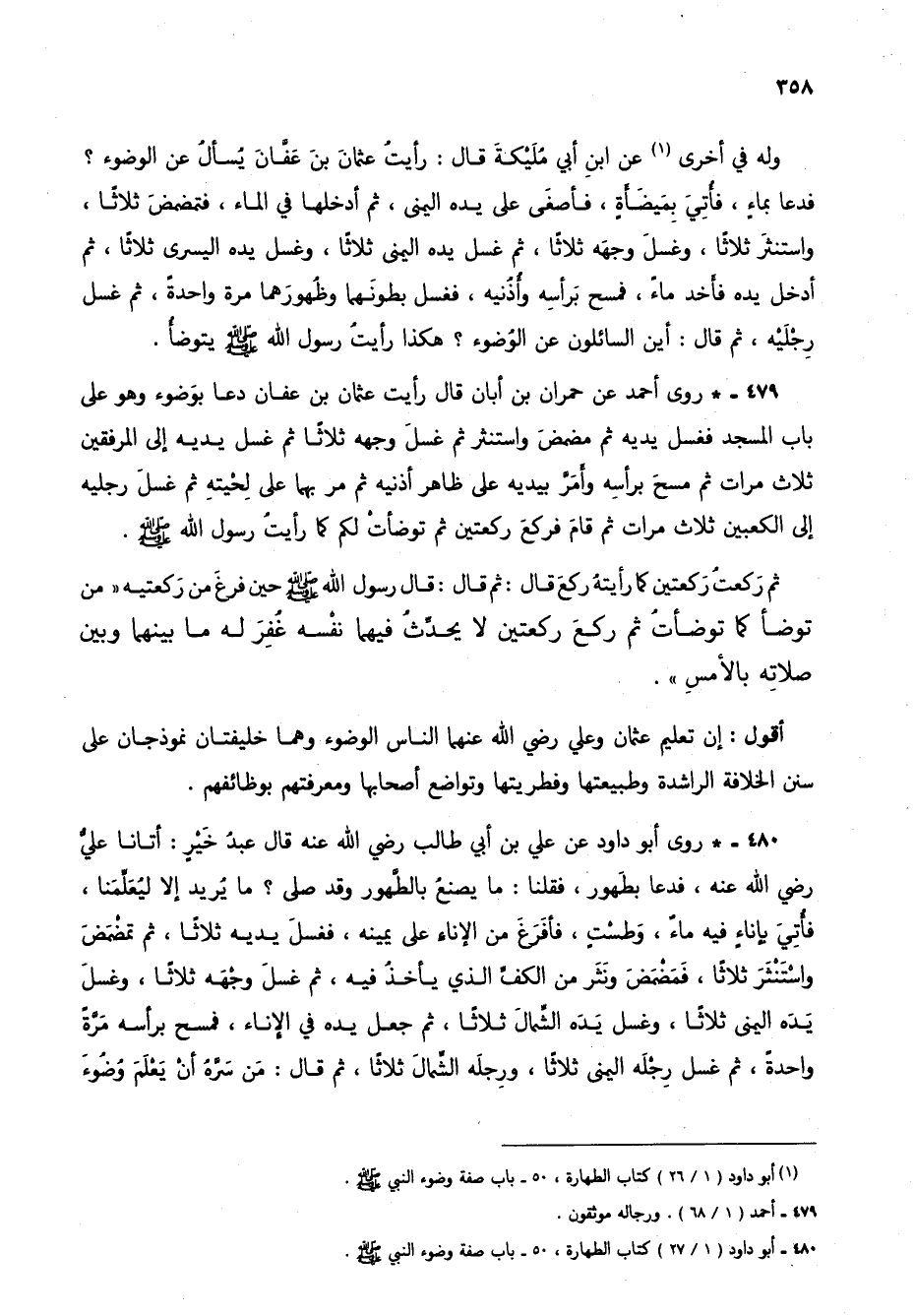 479 - * روى أحمد عن حمران بن أبان قال رأيت عثمان بن عفان دعا بوضوء وهو على باب المسجد فغسل يديه ثم مضمض واستنثر ثم غسل وجهه ثلاثاً ثم غسل يديه إلى المرفقين ثلاث مرات ثم مسح برأسه وأمر بيديه على ظاهر أذنيه ثم مر بهما على لحيته ثم غسل رجليه إلى الكعبين ثلاث مرات ثم قام فركع ركعتين ثم توضأت لكم كما رأيت رسول الله صلى الله عليه وسلم.