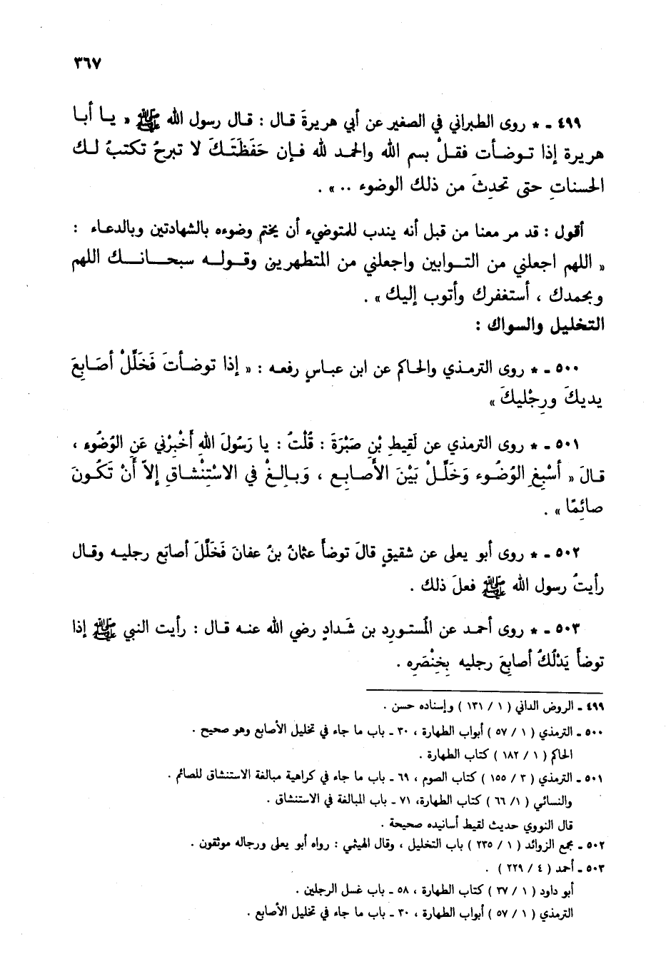 503 - * روى أحمد عن المستورد بن شدادٍ رضي الله عنه قال: رأيت النبي صلى الله عليه وسلم إذا توضأ يدلُكُ أصابع رجليه بخنصره.