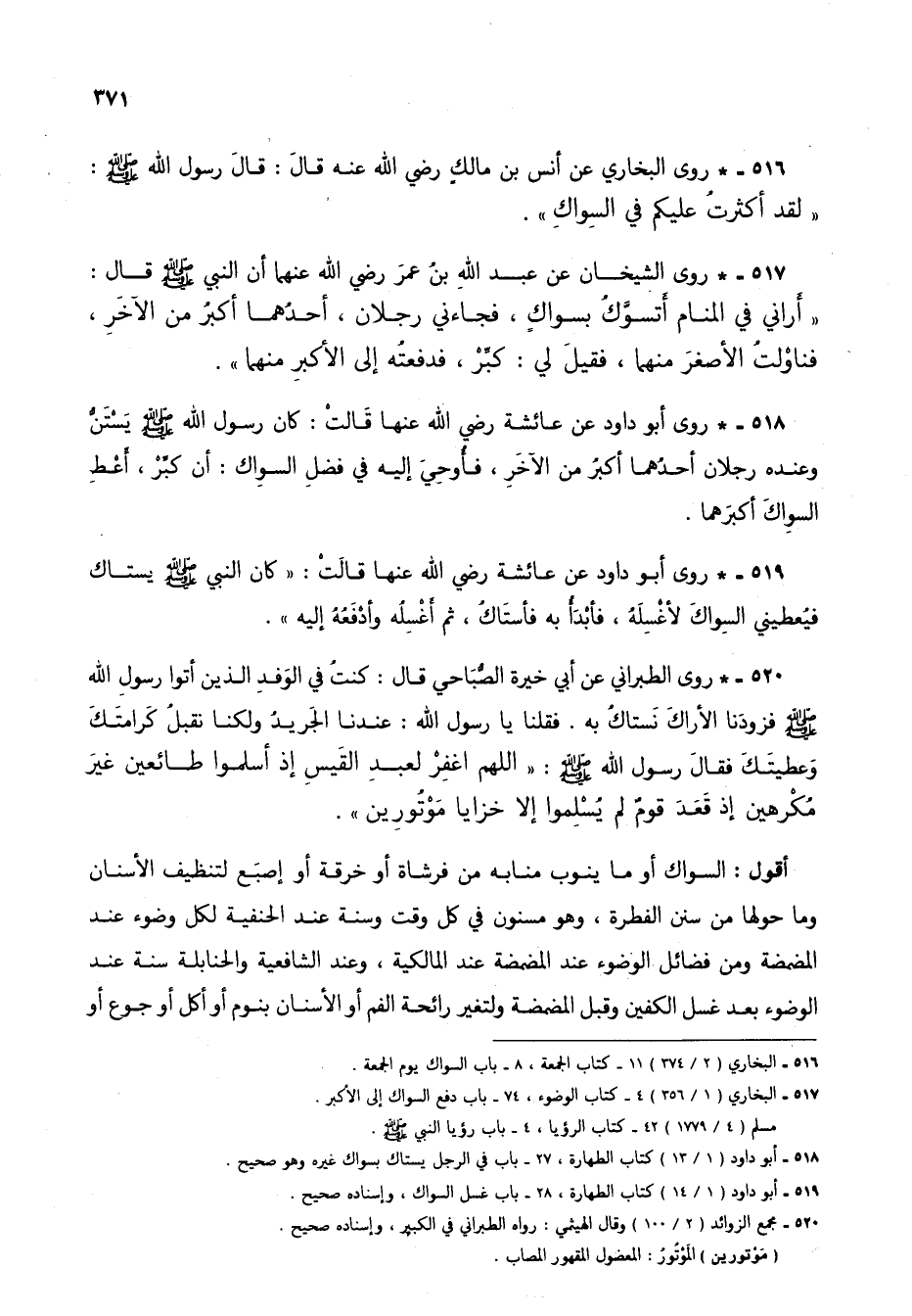 516 - * روى البخاري عن أنس بن مالك رضي الله عنه قال: قال رسول الله صلى الله عليه وسلم: "لقد أكثرتُ عليكم في السواك".
