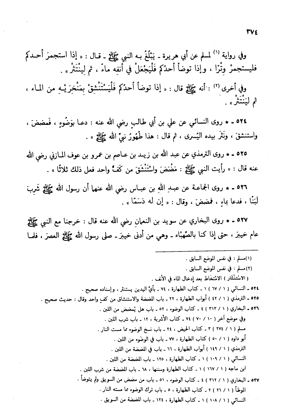524 - * روى النسائي عن علي بن أبي طالب رضي الله عنه: دعا بوضوءٍ، فمضمض، واستنشق، ونثر بيده اليسرى، ثم قال: هذا طهور نبي الله صلى الله عليه وسلم".
