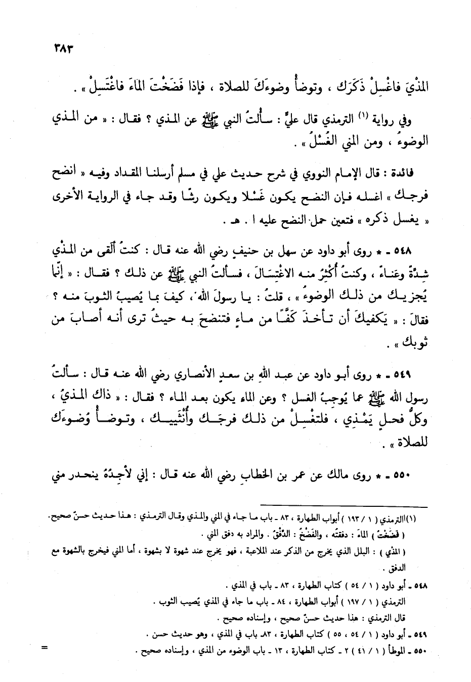 548 - * روى أبو داود عن سهل بن حنيفٍ رضي الله عنه قال: كنتُ ألقى من المذي شدةً وعناءً، وكنتُ أُكثرُ منه الاغتسال، فسألتُ النبي صلى الله عليه وسلم عن ذلك؟ فقال: "إنما يُجزيك من ذلك الوضوءُ"، قلتُ: يا رسول الله، كيف بما يُصيب الثوب منه؟ فقال: "يكفيك أن تأخذ كفاً من ماءٍ فتنضح به حيثُ ترى أنه أصاب من ثوبك".