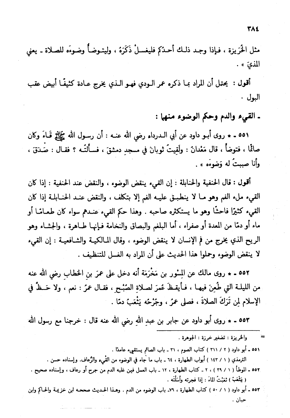 551 - * روى أبو داود عن أبي الدرداء رضي الله عنه: أن رسول الله صلى الله عليه وسلم قاءَ وكان صائماً، فتوضأ، قال معدانُ: ولقيتُ ثوبان في مسجد دمشق، فسألتُه؟ فقال: صدق، وأنا صببتُ له وضوءه".