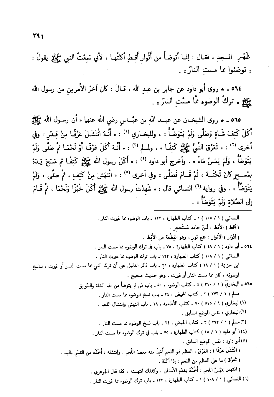565 - * روى الشيخان عن عبد الله بن عباس رضي الله عنهما "أن رسول الله صلى الله عليه وسلم أكل كتف شاةٍ وصلى ولم يتوضأْ"، وللبخاري (1): "أنه انتشَلَ عرقاً من قدرٍ" وفي أخرى (2): "تعرقَ النبيُّ صلى الله عليه وسلم كتفاً"، ولمسلم (3): "أنهُ أكل عرقاً أو لحماً ثم صلى ولم يتوضأ، ولم يمس ماءً". وأخرج أبو داود (4): "أكل رسول الله صلى الله عليه وسلم كتفاً ثم مسح يدهُ بمسحٍ كان تحتهُ، ثم قام فصلى" وفي أخرى (5): "انتهَشَ منْ كتفٍ، ثم صلى، ولمْ يتوضأ". وفي رواية (6) النسائي قال: "شهدتُ رسول الله صلى الله عليه وسلم أكل خُبزاً ولحماً، ثم قام إلى الصلاة ولم يتوضأْ".