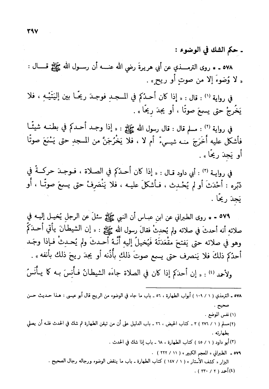 578 - * روى الترمذي عن أبي هريرة رضي الله عنه أن رسول الله صلى الله عليه وسلم قال: "لا وضوء إلا من صوتٍ أو ريحٍ".