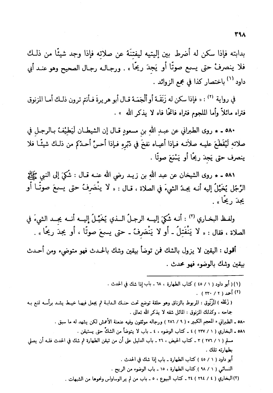 580 - *روى الطبراني عن عبد الله بن مسعود قال إن الشيطان ليطيْفُ بالرجل في صلاته ليْقطع عليه صلاته فإذا أعياه نفخ في دبره فإذا أحس أحدُكم من ذلك شيئاً فلا ينصرف حتى يجد ريحاً أو يسمع صوتاً.