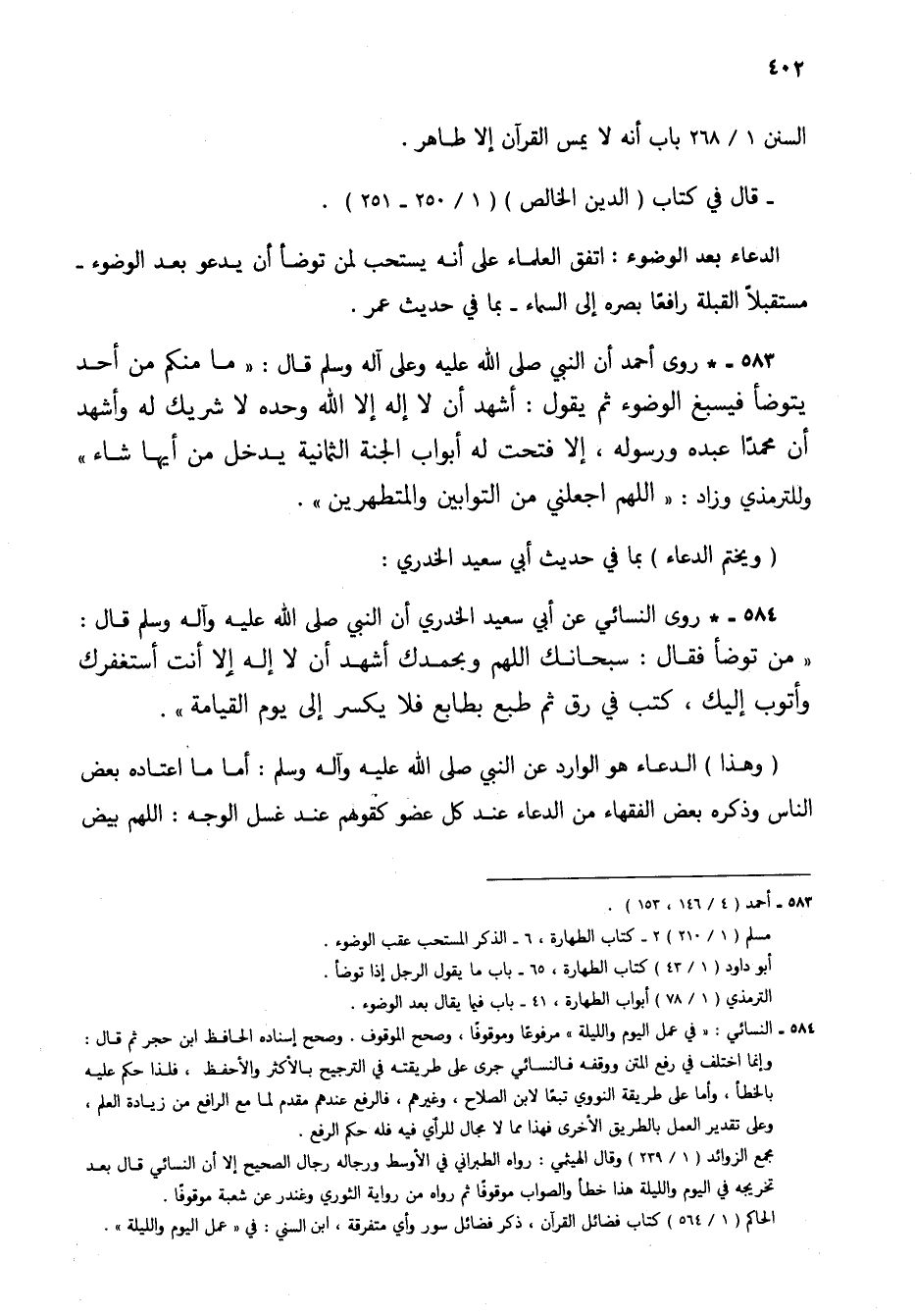 584 - * روى النسائي عن أبي سعيد الخدري أن النبي صلى الله عليه وآله وسلم قال: "من توضأ فقال: سبحانك اللهم وبحمدك أشهد أن لا إله إلا أنت أستغفرك وأتوب إليك، كتب في رق ثم طبع بطابع فلا يكسر إلى يوم القيامة".