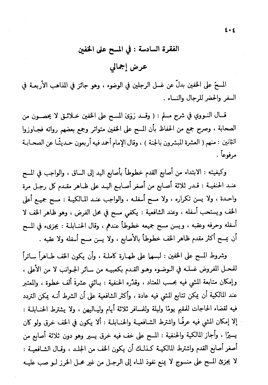 المسحُ على الخفين بدلٌ عن غسل الرجلين في الوضوء، وهو جائز في المذاهب الأربعة في السفر والحضر للرجال والنساء.