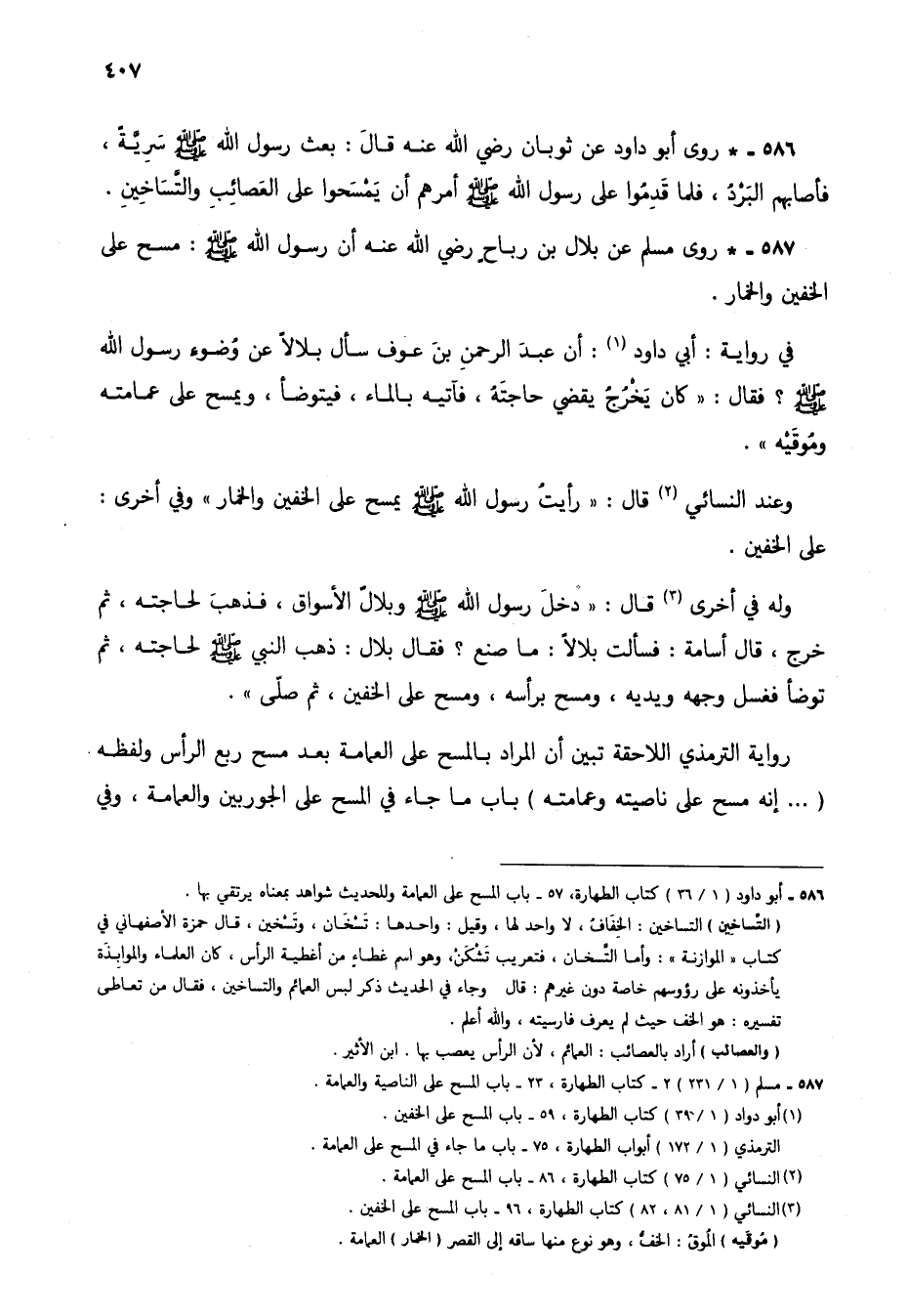 586 - * روى أبو داود عن ثوبان رضي الله عنه قال: بعث رسول الله صلى الله عليه وسلم سرية، فأصابهم البردُ، فلما قدموا على رسول الله صلى الله عليه وسلم أمرهم أن يمسحوا على العصائب والتَّساخين.