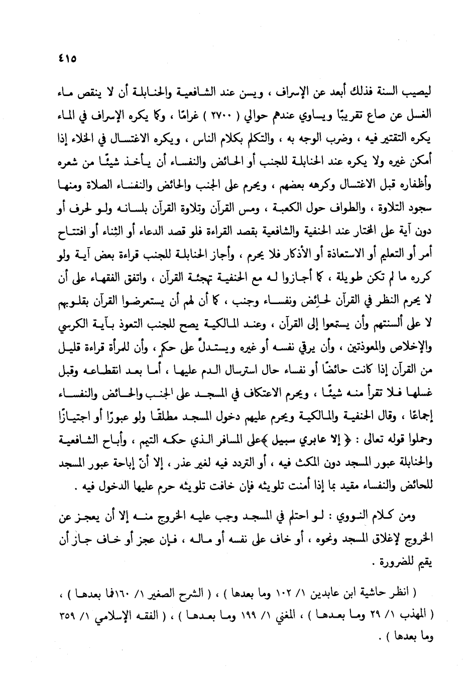 ليصيب السنة فذلك أبعد عن الإسراف، ويسن عند الشافعية والحنابلة أن لا ينقص ماء الغسل عن صاع تقريباً ويساوي عندهم حوالي (2700) غراماً، وكما يكره الإسراف في الماء يكره التقتير فيه، وضرب الوجه به، والتكلم بكلام الناس، ويكره الاغتسال في الخلاء إذا أمكن غيره ولا يكره عند الحنابلة للجنب أو الحائض والنفساء أن يأخذ شيئاً من شعره وأظفاره قبل الاغتسال وكرهه بعضهم، ويحرم على الجنب والحائض والنفساء الصلاة ومنها سجود التلاوة، والطواف حول الكعبة، ومس القرآن وتلاوة القرآن بلسانه ولو لحرف أو دون آية على المختار عند الحنفية والشافعية بقصد القراءة فلو قصد الدعاء أو الثناء أو افتتاح أمر أو التعليم أو الاستعاذة أو الأذكار فلا يحرم، وأجاز الحنابلة للجنب قراءة بعض آية ولو كرره ما لم تكن طويلة، كما أجازوا له مع الحنفية تهجئة القرآن، واتفق الفقهاء على أن لا يحرم النظر في القرآن لحائض ونفساء وجنب، كما أن لهم أن يستعرضوا القرآن بقلوبهم لا على ألسنتهم وأن يستمعوا إلى القرآن، وعند المالكية يصح للجنب التعوذ بآية الكرسي والإخلاص والمعوذتين، وأن يرقي نفسه أو غيره ويستدل على حكمٍ، وأن للمرأة قراءة قليل من القرآن إذا كانت حائضاً أو نفساء حال استرسال الدم عليها، أما بعد انقطاعه وقبل غسلها فلا تقرأ منه شيئاً، ويحرم الاعتكاف في المسجد على الجنب والحائض والنفساء إجماعاً، وقال الحنفية والمالكية ويحرم عليهم دخول المسجد مطلقاً ولو عبوراً أو اجتيازاً وحملوا قوله تعالى: {إِلَّا عَابِرِي سَبِيلٍ} على المسافر الذي حكمه التيمم، وأباح الشافعية والحنابلة عبور المسجد دون المكث فيه، أو التردد فيه لغير عذر، إلا أن إباحة عبور المسجد للحائض والنفساء مقيد بما إذا أمنت تلويثه فإن خافت تلويثه حرم عليها الدخول فيه.