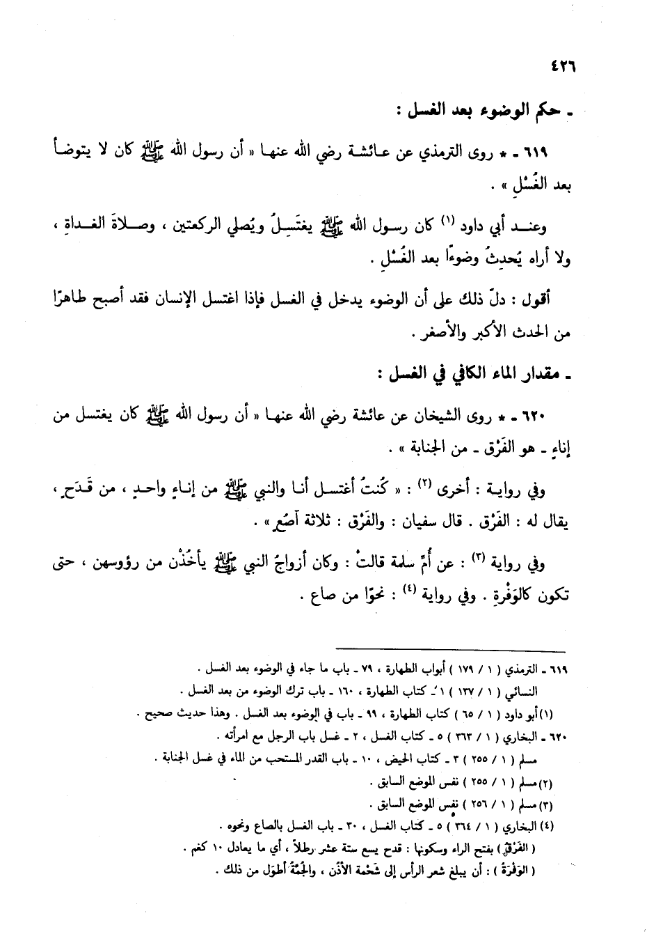 619 - * روى الترمذي عن عائشة رضي الله عنها "أن رسول الله صلى الله عليه وسلم كان لا يتوضأ بعد الغُسل".