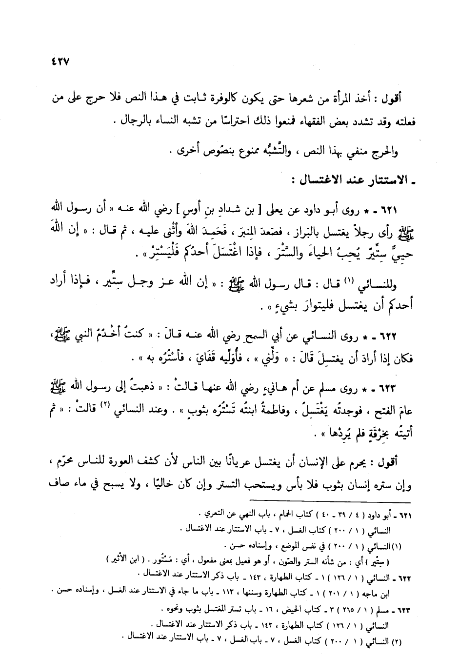 622 - * روى النسائي عن أبي السمح رضي الله عنه قال: "كنتُ أخدُم النبي صلىلله عليه وسلم، فكان إذا أراد ان يغتسل قال: "ولِّني"، فأوليه قفاي، فأسترُه به".