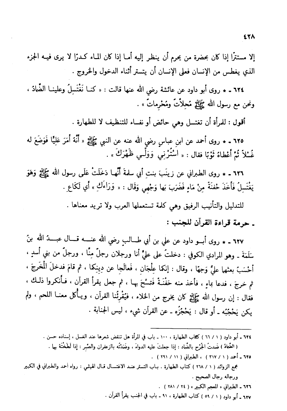 624 - * روى أبو داود عن عائشة رضي الله عنها قالت: "كنا نغتسِلُ وعلينا الضمادُ، ونحن مع رسول الله صلى الله عليه وسلم مُحلات ومحرماتٌ".