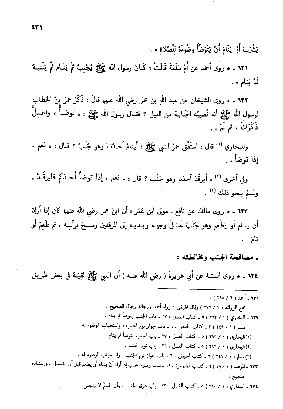 631 - * روى أحمد عن أم سلمة قالت "كان رسول الله صلى الله عليه وسلم يُجنِبُ ثم ينام ثم ينتبه ثم ينام".