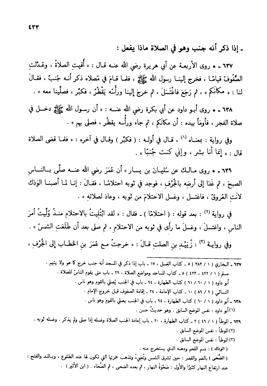 637 - * روى الأربعة عن أبي هريرة رضي الله عنه قال: "أُقيمت الصلاةُ، وعُدلت الصفوف قياماً، فخرج إلينا رسول الله صلى الله عليه وسلم، فلما قام في مُصلاه ذكر أنه جنبٌ، فقال لنا: "مكانكم"، ثم رجع فاغتسل، ثم خرج إلأينا ورأسه يقطر، فكبر، فصلينا معه".