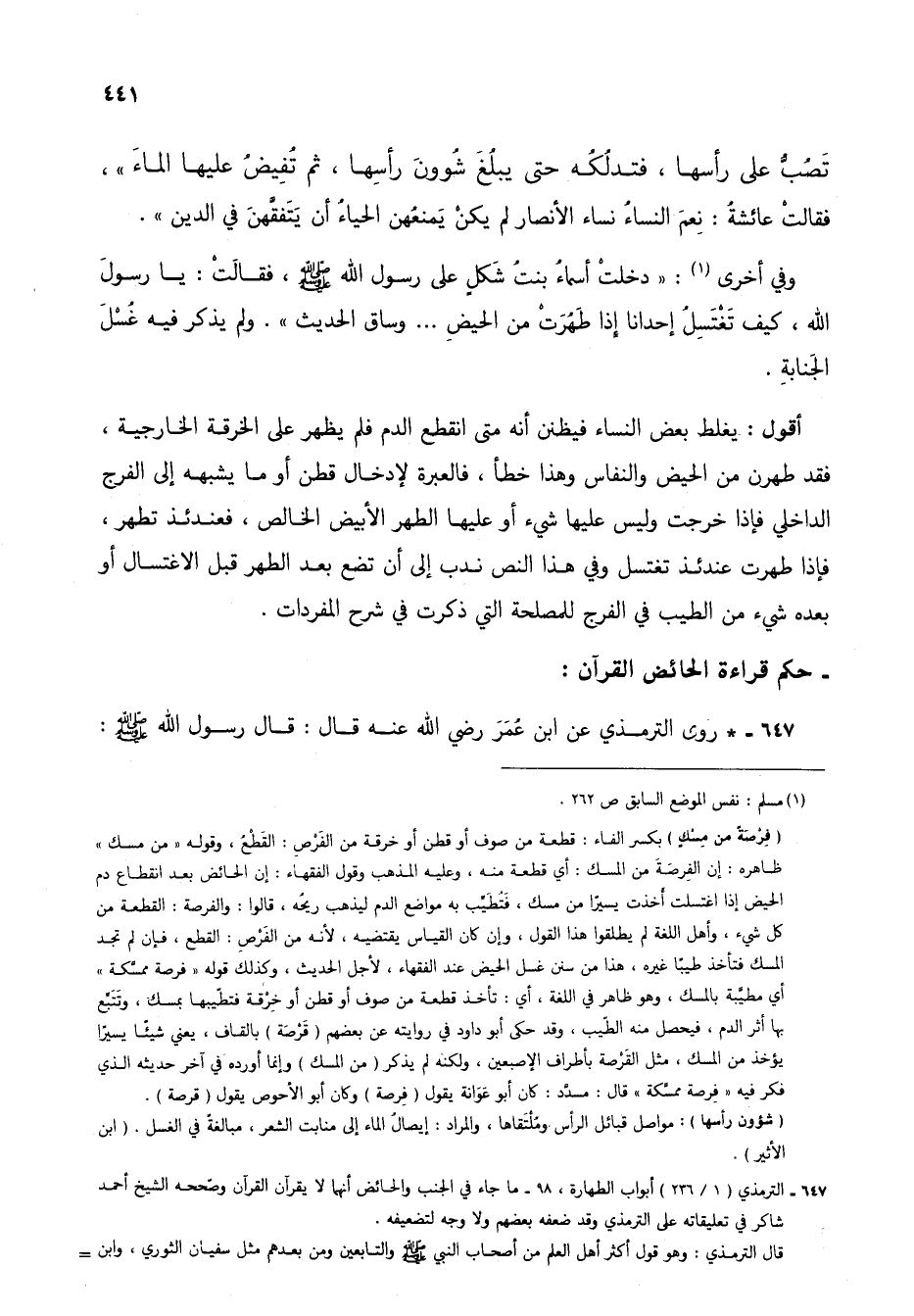 أقول: يغلط بعض النساء فيظنن أنه متى انقطع الدم فلم يظهر على الخرقة الخارجية، فقد طهرن من الحيض والنفاس وهذا خطأ، فالعبرة لإدخال قطن أو ما يشبهه إلى الفرج الداخلي فإذا خرج وليس عليها شيء أو عليها الطهر الأبيض الخالص، فعندئذ تطهر، فإذا طهرت عندئذ تغتسل وفي هذا النص ندب إلى أن تضع بعد الطهر قبل الاغتسال أو بعده شيء من الطيب في الفرج للمصلحة التي ذكرت في شرح المفردات.