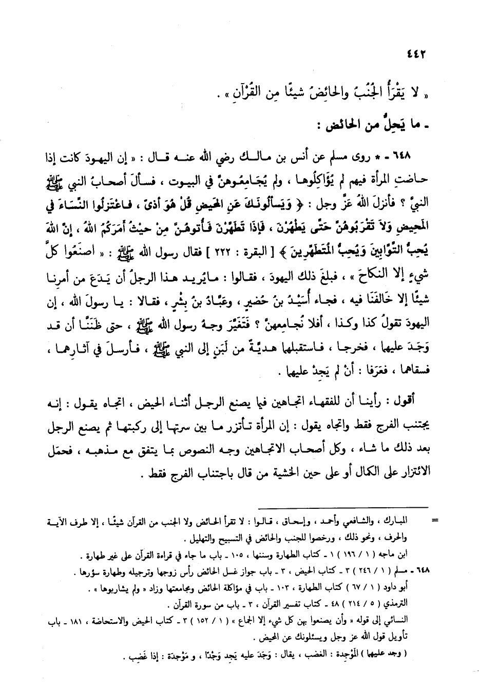 648 - * روى مسلم عن أنس بن مالك رضي الله عنه قال: "إن اليهود كانت إذا حاضت المرأة فيهم لم يؤاكلُوها، ولم يجامعوهن في البيوت، فسأل أصحاب النبي صلى الله عليه وسلم النبي؟ فأنزل الله عز وجل: {وَيَسْأَلُونَكَ عَنِ الْمَحِيضِ قُلْ هُوَ أَذًى فَاعْتَزِلُوا النِّسَاءَ فِي الْمَحِيضِ وَلَا تَقْرَبُوهُنَّ حَتَّى يَطْهُرْنَ فَإِذَا تَطَهَّرْنَ فَأْتُوهُنَّ مِنْ حَيْثُ أَمَرَكُمُ اللَّهُ إِنَّ اللَّهَ يُحِبُّ التَّوَّابِينَ وَيُحِبُّ الْمُتَطَهِّرِينَ} [البقرة: 222] فقال رسول الله صلى الله عليه وسلم: "اصنعوا كل شيء إلا النكاح"، فبلغ ذلك اليهود، فقالوا: ما يُريد هذا الرجل أن يدع من أمرنا شيئاً إلا خالفنا فيه، فجاء أُسيدُ بن حُضيرٍ، وعبادُ بن بشر، فقالا: يا رسول الله، إن اليهود تقول كذا وكذا، أفلا نُجامعهنَّ؟ فتغير وجه رسول الله صلى الله عليه وسلم، حتى ظننا أن قد وجد عليهما، فخرجا، فاستقبلهما هديةٌ من لبنٍ إلى النبي صلى الله عليه وسلم، فأرسل في آثارهما، فسقاهما، فعرفا: أن لم يجد عليهما.